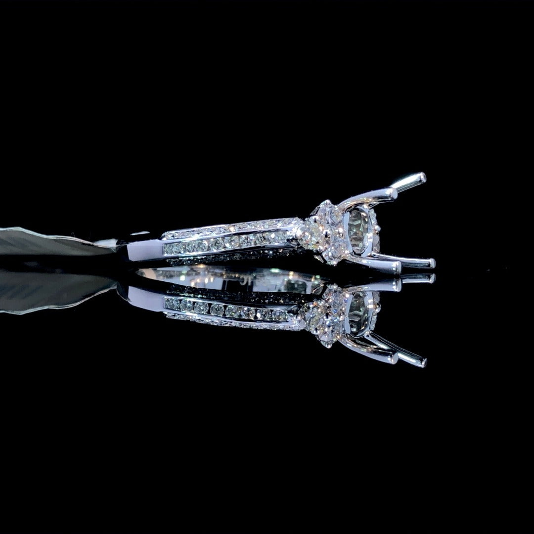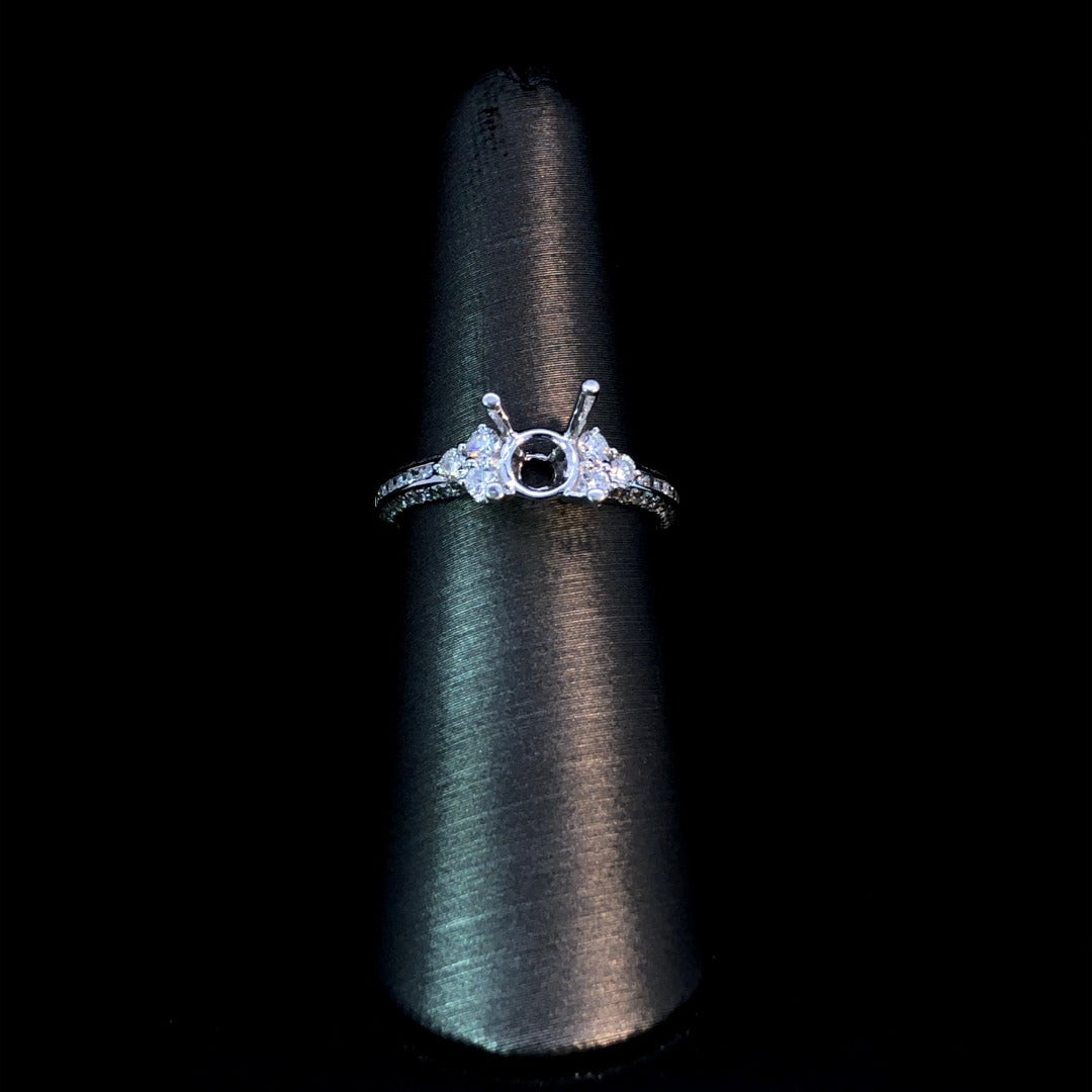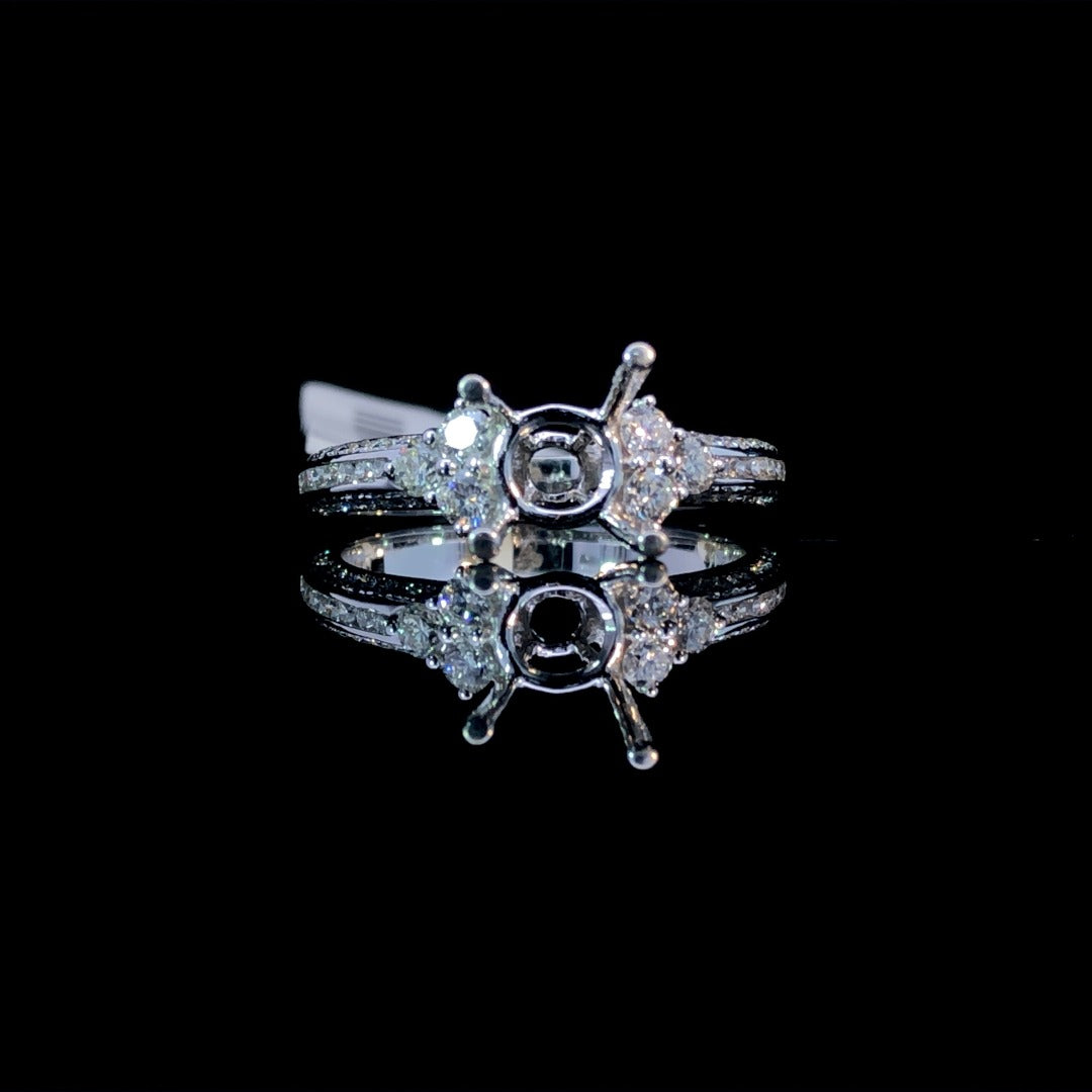 This exquisite diamond semi-mount is the ultimate expression of elegance. The 14kt white gold setting sparkles with an exquisite trillion design of side diamonds, further enhanced with luxurious diamond accents down the band, for a total weight of .60ctw. An exquisite choice for your special someone. Price is for the semi mount only. Center stone will be added at an additional cost. This ring is a size 6.5. If that size is not a perfect fit, first time sizing is free at the time of purchase. Additional sizing fees may apply.