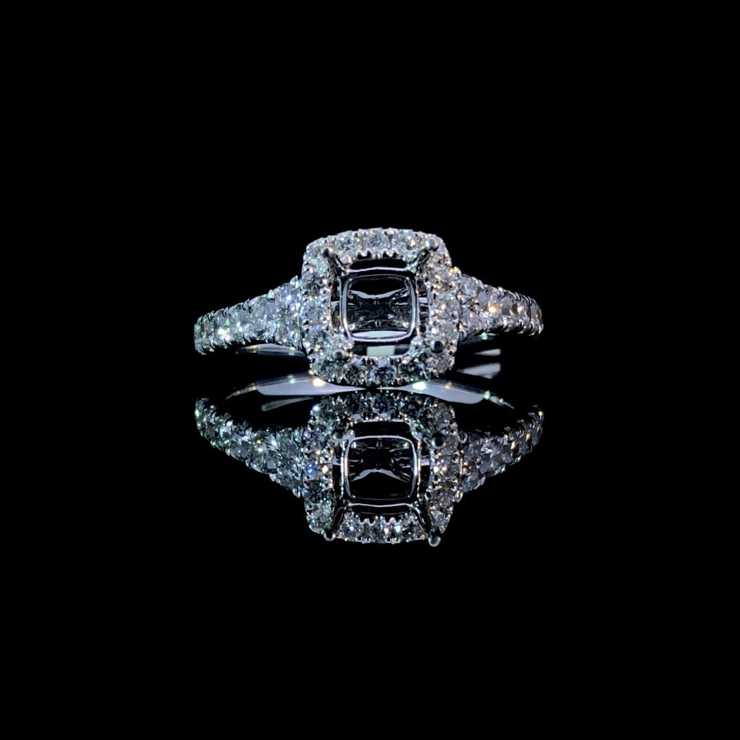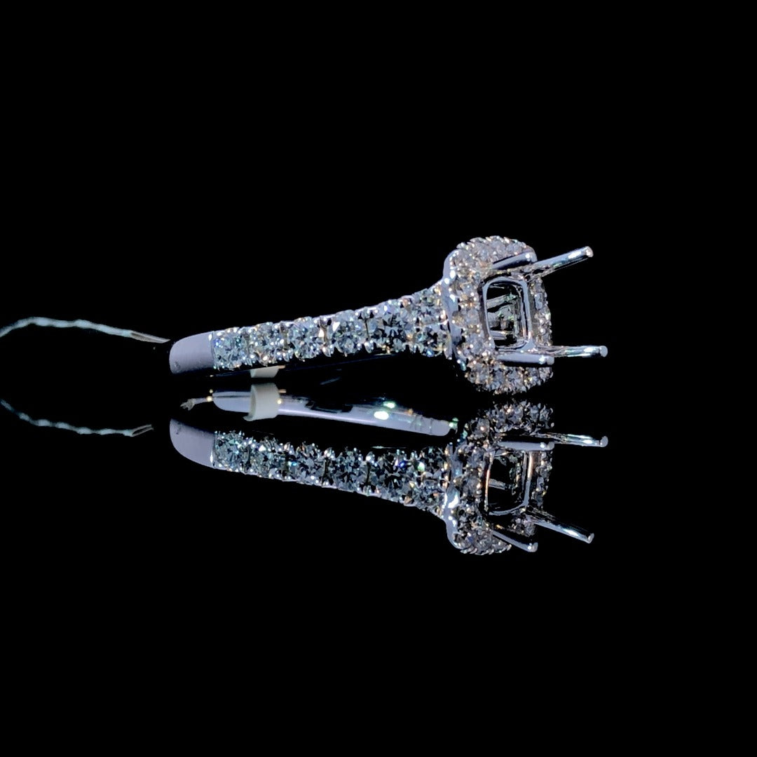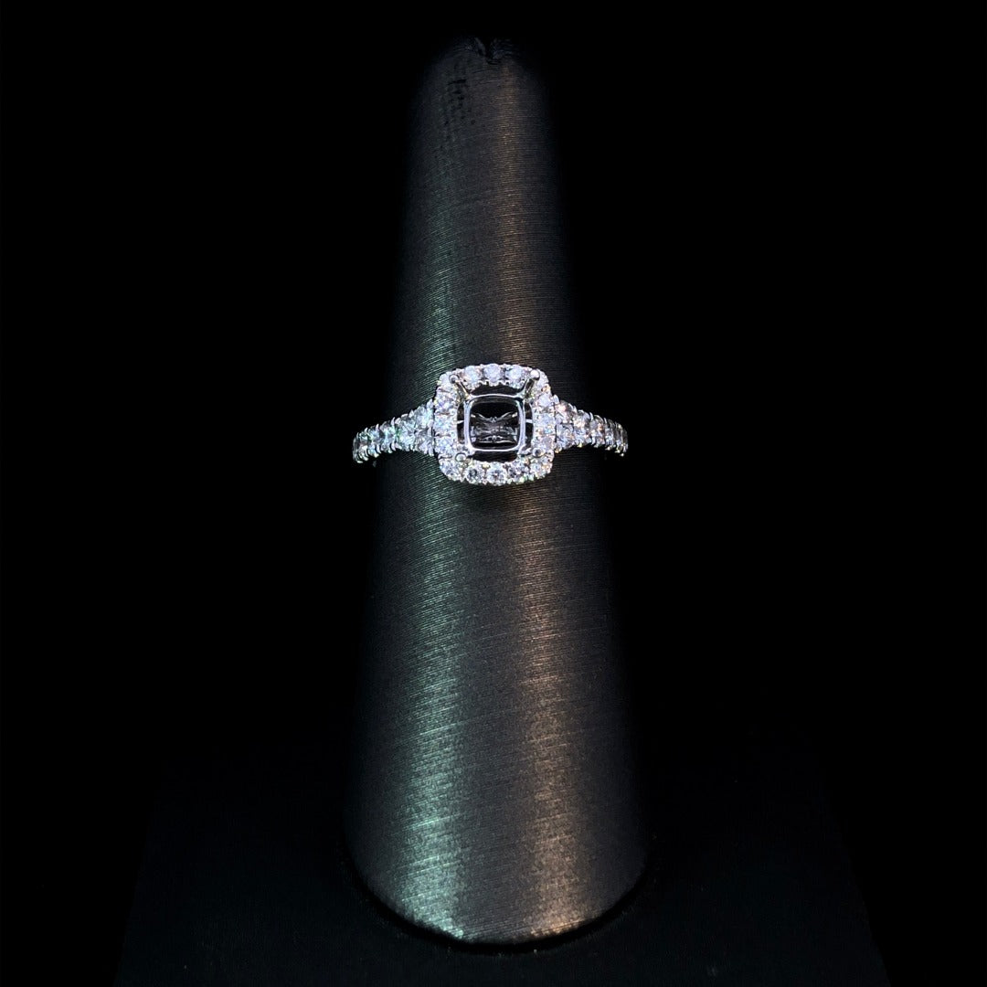 Indulge in classic elegance with this diamond semi mount. Crafted in 14kt white gold, the halo and band are adorned with glimmering round diamonds, totaling .63ctw. Customize with your choice of center stone from our wide selection. A timeless piece for the sophisticated bride. Price is for the semi mount only. Center stone will be added at an additional cost. This ring is a size 6.5. If that size is not a perfect fit, first time sizing is free at the time of purchase. Additional sizing fees may apply.