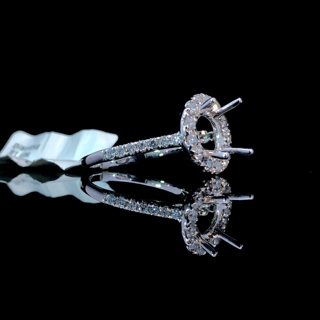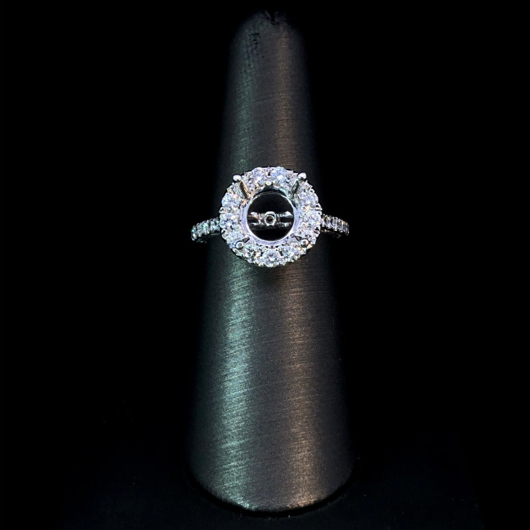 Indulge in pure luxury with our gorgeous diamond semi mount. Crafted in 14kt white gold, this stunning piece boasts a classic round halo design adorned with .81ctw of sparkling round diamonds. Personalize it with your choice of center stone from our exceptional collection for a truly exquisite look. Price is for the semi mount only. Center stone will be added at an additional cost. This ring is a size 6.5. If that size is not a perfect fit, first time sizing is free at the time of purchase. Additional sizing fees may apply.