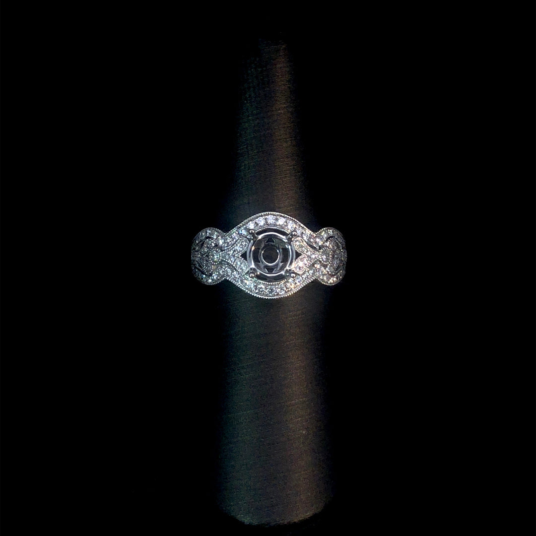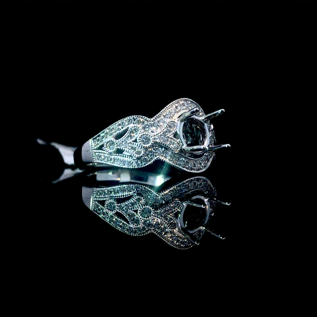 This exquisite diamond semi mount showcases intricate detailing with .42ctw of sparkling round diamonds nestled in lustrous 14kt white gold. The thoughtfully crafted design provides the perfect foundation for your vision—simply select your ideal center stone from our curated collection of premium loose diamonds to create a truly personalized engagement ring or statement piece that reflects your unique style and celebrates your special moment. Price is for the semi mount only. Center stone will be added at an additional cost. This ring is a size 7. If that size is not a perfect fit, first time sizing is free at the time of purchase. Additional sizing fees may apply.