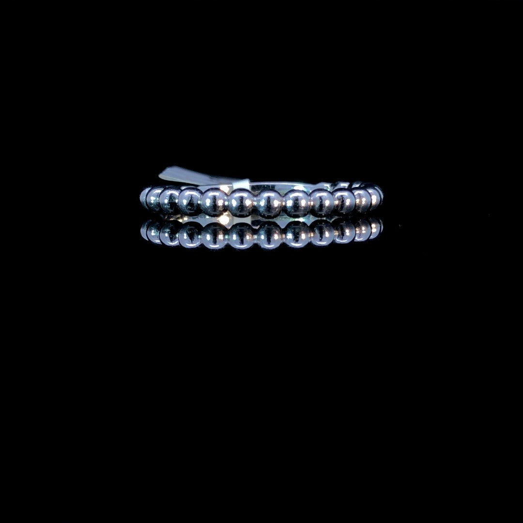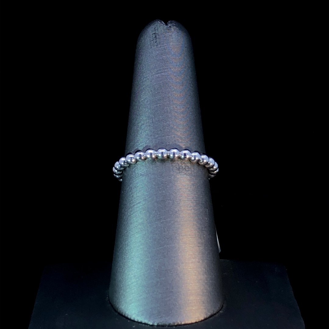 Add a beautiful, timeless touch to your jewelry collection with this 14kt white gold beaded band. This stackable accessory has a stunning and sophisticated look that never goes out of style. The small beading adds texture and detail that will make any look stand out. This ring is a size 7. If that size is not a perfect fit, first time sizing is free at the time of purchase. Additional sizing fees may apply.
