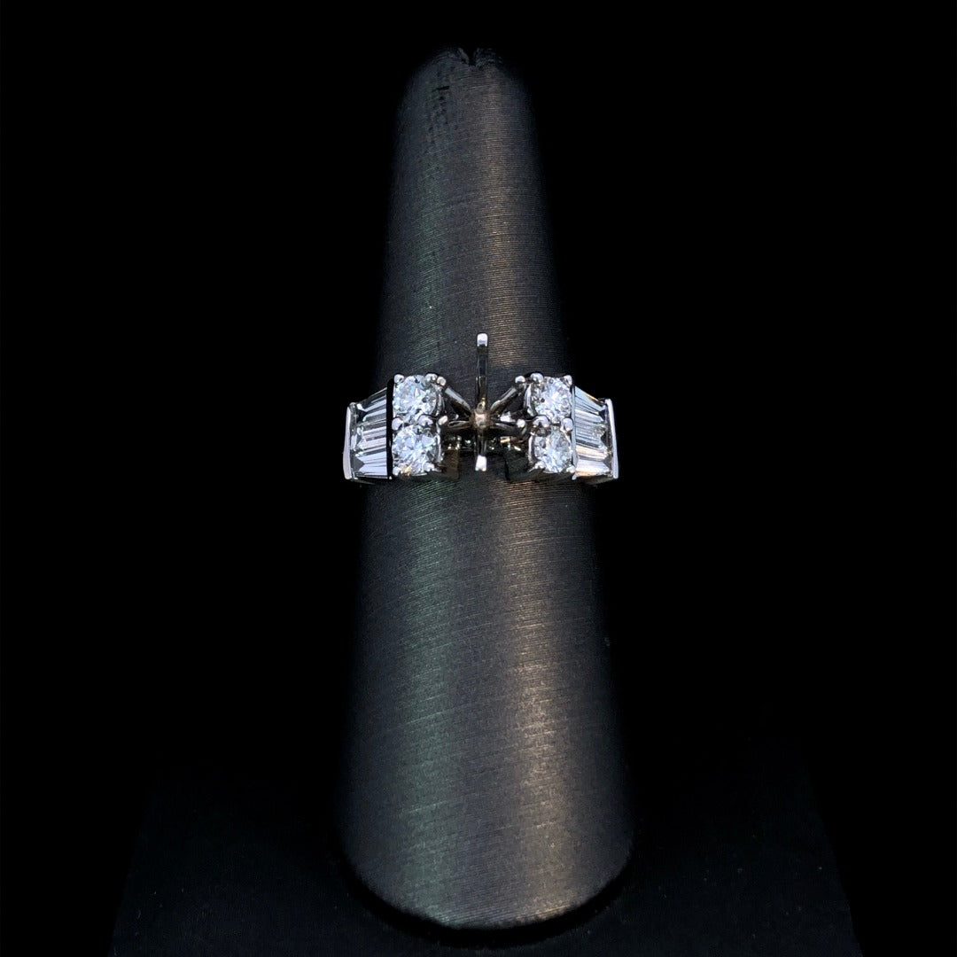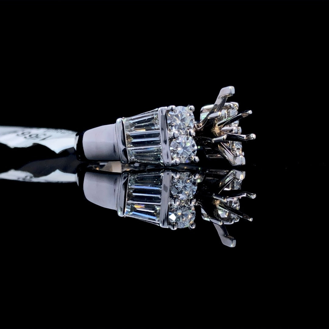 Elevate your jewelry collection with this gorgeous diamond semi mount. Crafted in 14kt white gold and decorated with 1.20ctw of round and baguette diamonds, this statement piece exudes luxury and sophistication. Complete it with a center stone of your choice from our vast selection for a truly unique and spectacular look. Price is for the semi mount only. Center stone will be added at an additional cost. This ring is a size 7. If that size is not a perfect fit, first time sizing is free at the time of purchase. Additional sizing fees may apply.