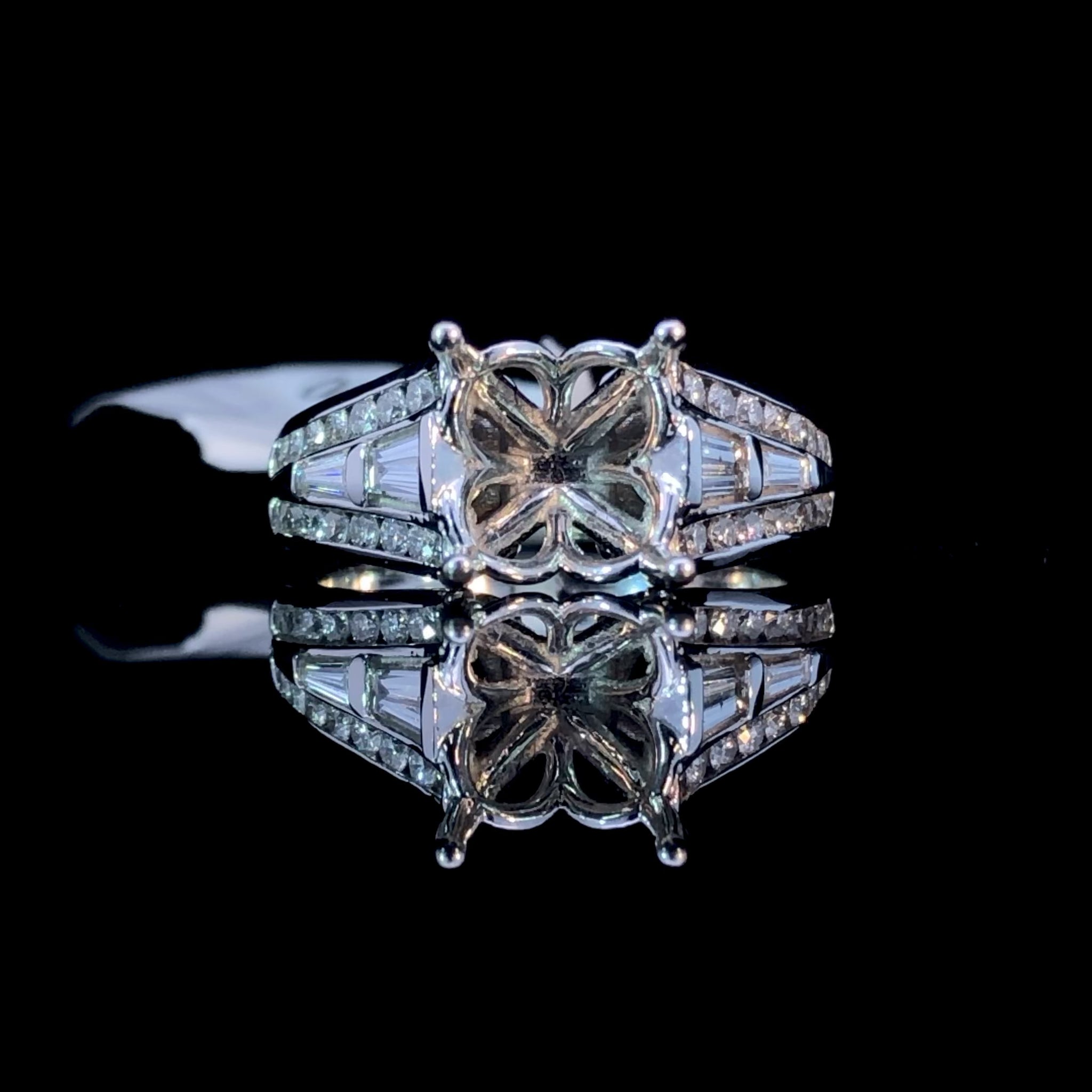 Turn heads with this dazzling diamond semi mount! Expertly crafted with .76ctw of round and baguette diamonds set in 14kt white gold, it is a timeless showstopper that will bring brilliance to every occasion. Make it your own by adding a center stone and create a unique symbol of your love that will last for generations. Price is for the semi mount only. Center stone will be added at an additional cost. This ring is a size 6.5. If that size is not a perfect fit, first time sizing is free at the time of purchase.
