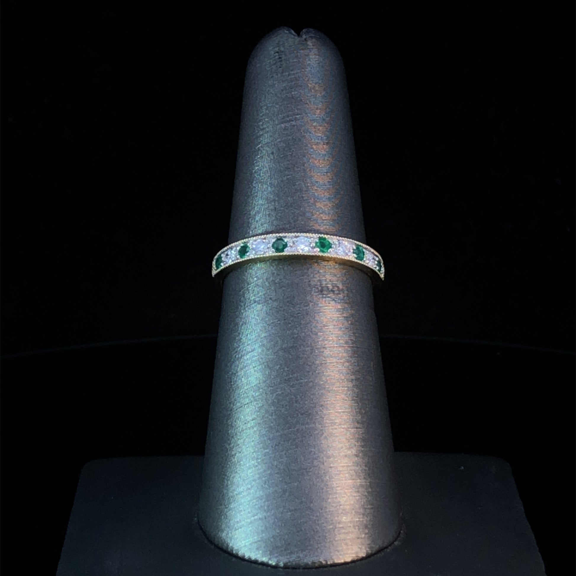 Show your style and sophistication with this unique and stunning diamond and emerald band. Crafted with .31ctw of alternating diamonds and emeralds set in a 10kt yellow gold milgrain band, it's sure to be a timeless addition to your collection! This ring is a size 6.5. If that size is not a perfect fit, first time sizing is free at the time of purchase. Additional sizing fees may apply.