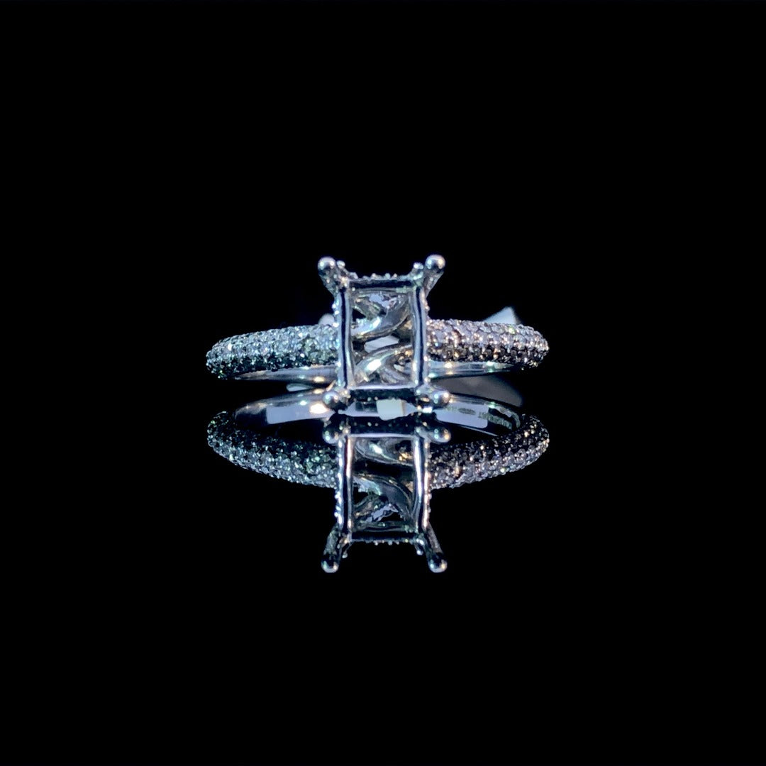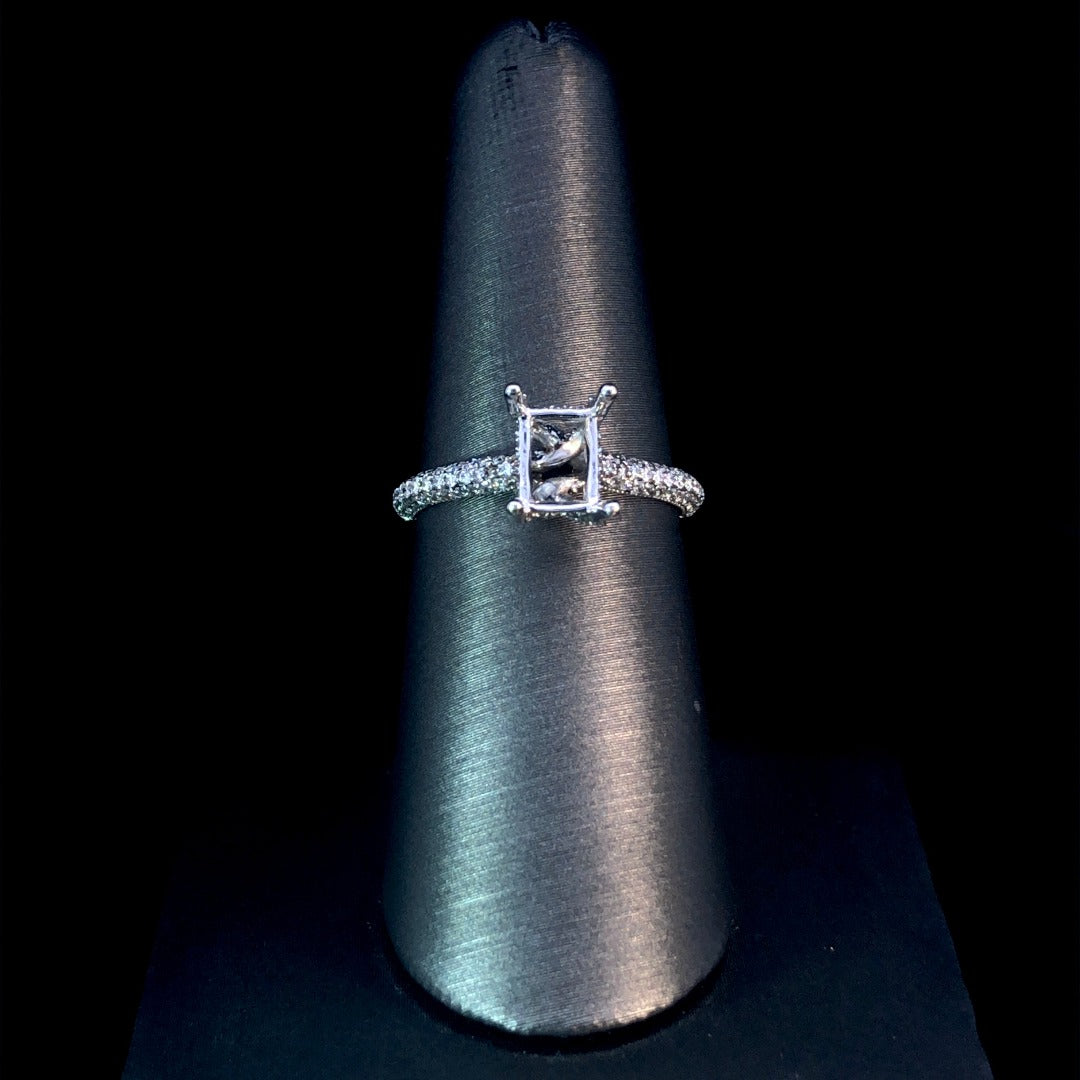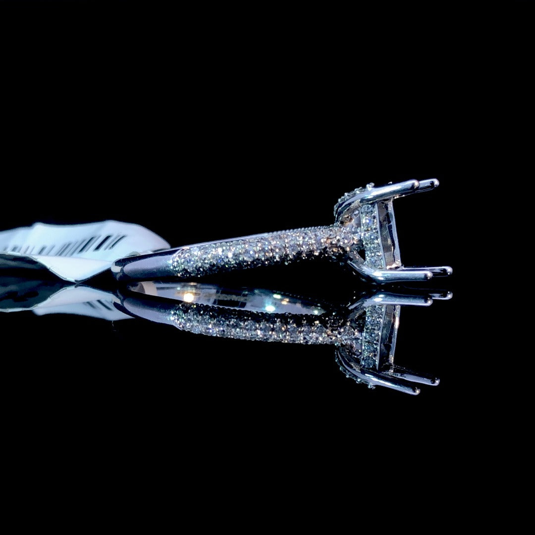 Elevate your jewelry collection with this gorgeous diamond semi mount. Designed with a hidden halo and criss-cross style head, this stunning piece exudes luxury. With diamonds set all around the head, and pave set down the band, it boasts a total diamond weight of .50ctw in 14kt white gold. Choose your own center stone for a personalized touch. Price is for the semi mount only. Center stone will be added at an additional cost. This ring is a size 7. If that size is not a perfect fit, first time sizing is free at the time of purchase. Additional sizing fees may apply.