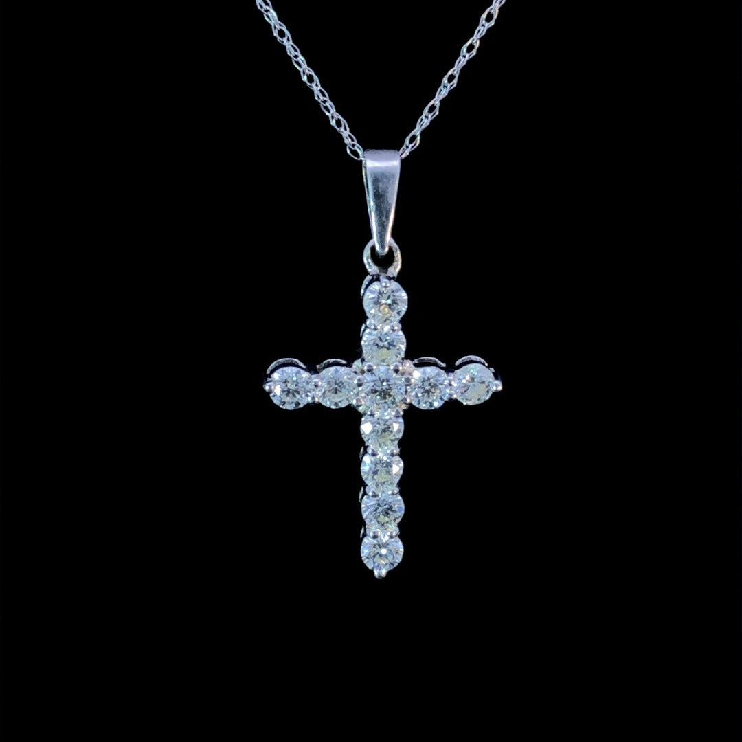 Treat yourself to stunning elegance with this classic diamond cross pendant. Crafted with .96ctw of round diamonds set in sparkling 10kt white gold, this piece is sure to become a treasured heirloom. Show off your faith and style with this beautiful diamond-studded cross pendant! Chain is not included.