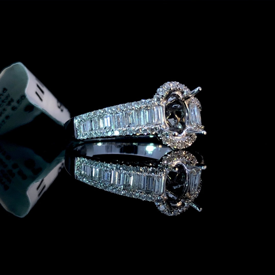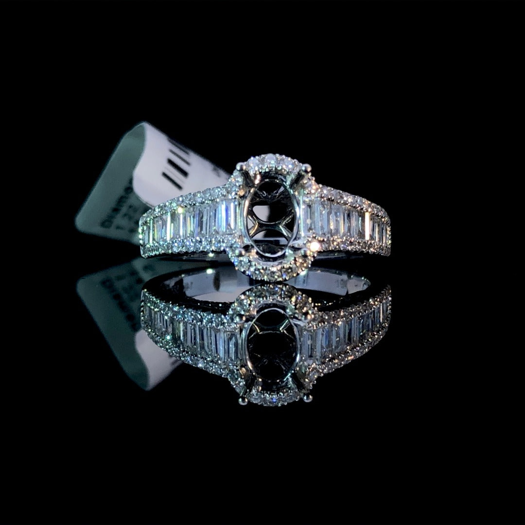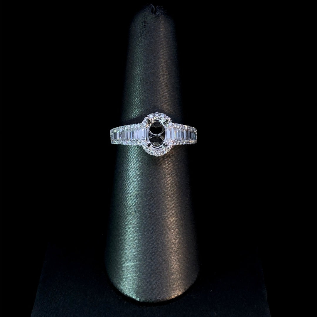 Elevate your style with this stunning semi mount. Crafted in 14kt white gold, this piece features a dazzling oval halo of round diamonds, surrounded by a band of baguette diamonds and accented with even more round diamonds. With a total diamond weight of 1.22ctw, choose your own center stone to make it a truly unique and luxurious addition to your collection. Price is for the semi mount only. Center stone will be added at an additional cost. This ring is a size 6.5. If that size is not a perfect fit, first time sizing is free at the time of purchase.