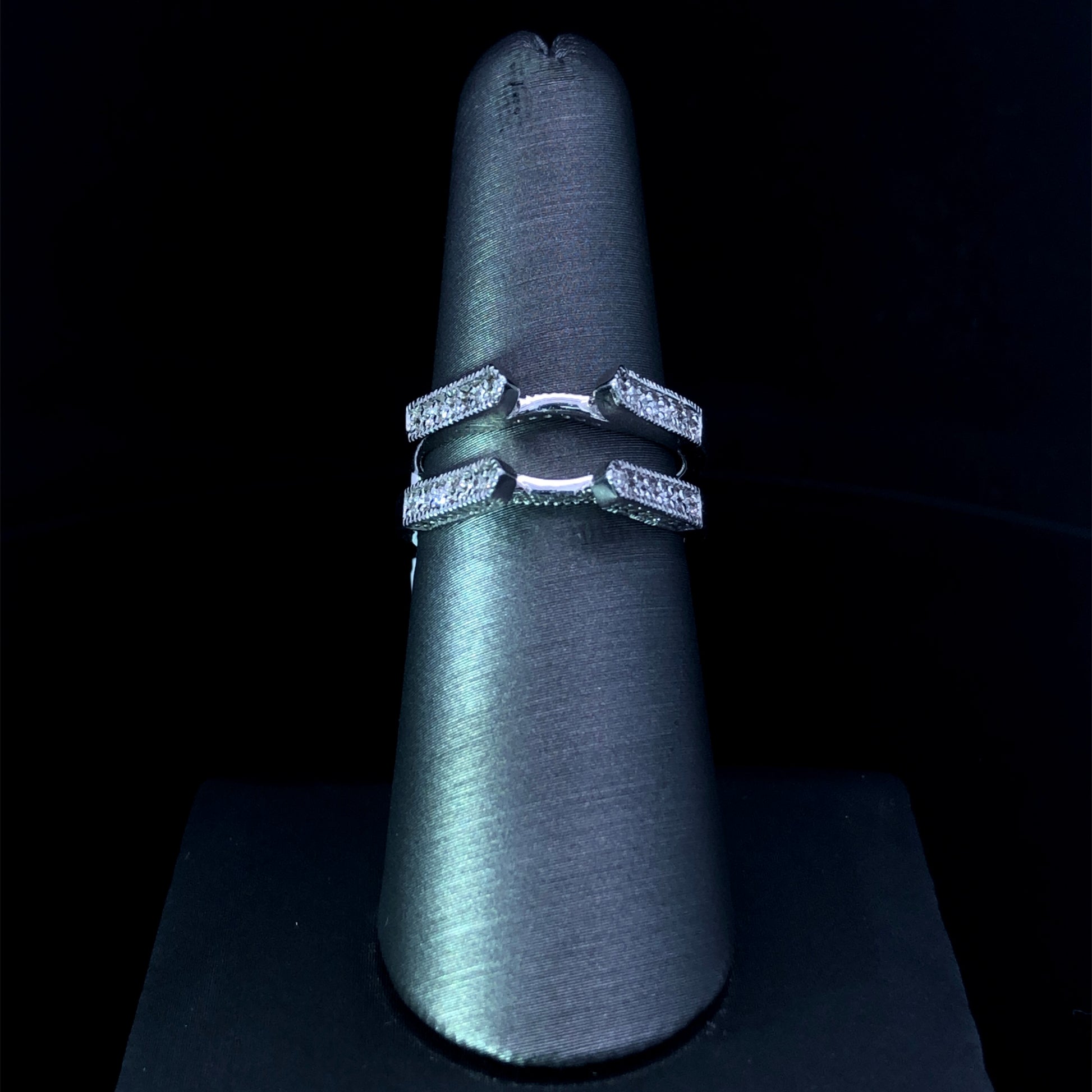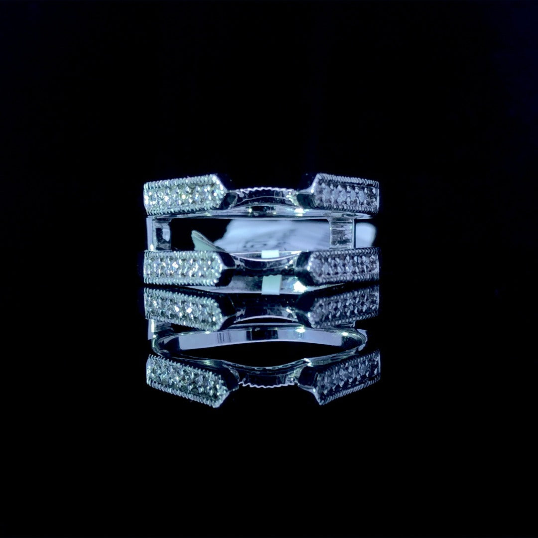 This exquisite ring guard adds a delicate touch of glamour to your look. The .55ctw of round diamonds sparkle in a decorative milgrain setting, boasting a sophisticated beauty that won't go unnoticed. Crafted from luxurious 14kt white gold, this ring guard is sure to become a favorite. This ring is a size 7. If that size is not a perfect fit, first time sizing is free at the time of purchase. Additional sizing fees may apply.