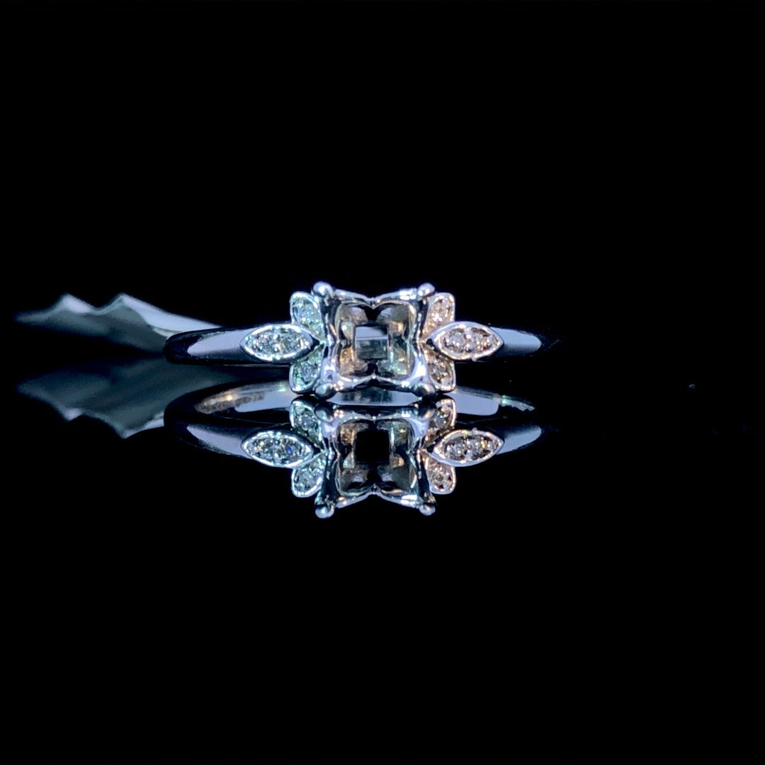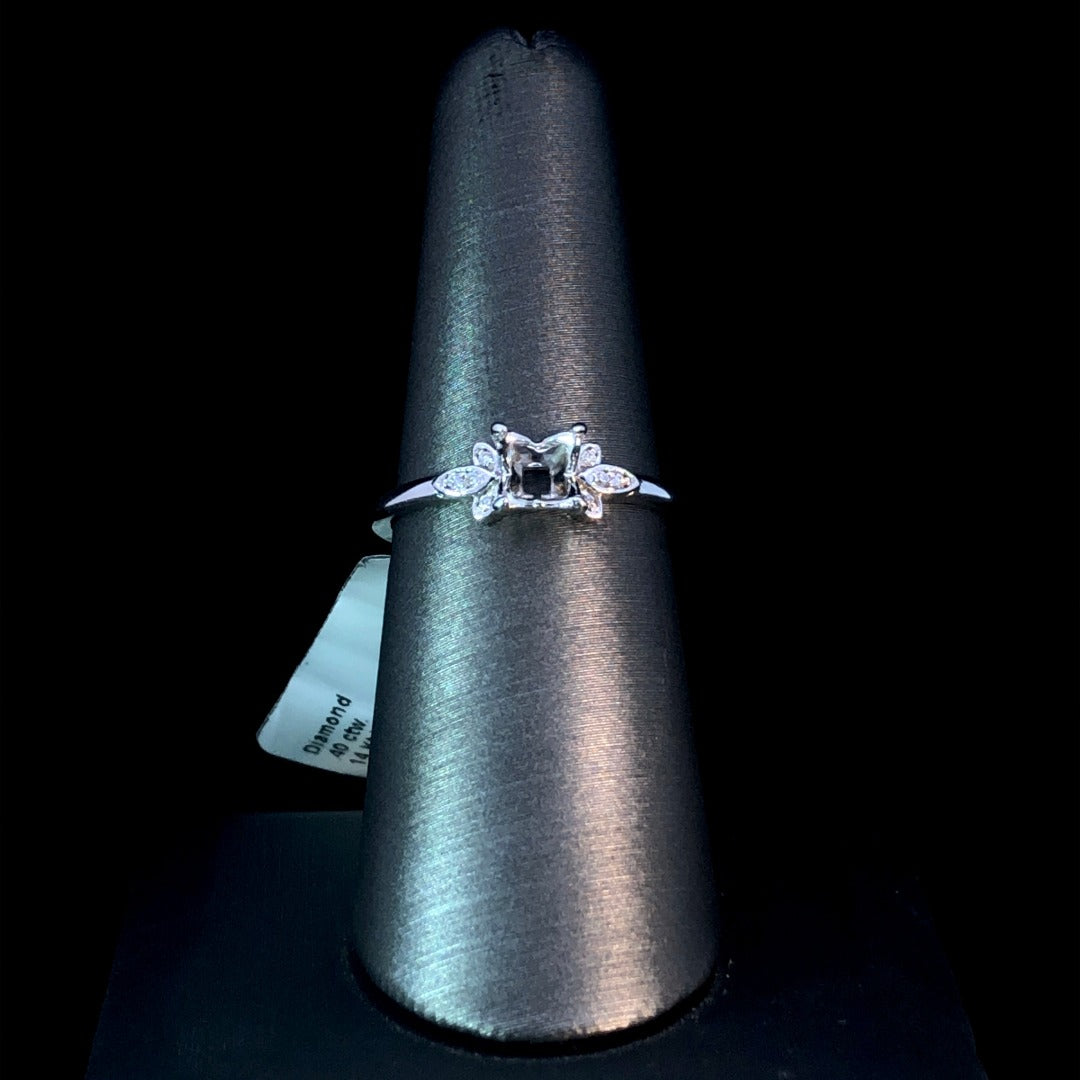 Elevate your look with our stunning diamond semi mount. The intricate floral design is accented with sparkling .40ctw of round diamonds in 14kt white gold. Choose the perfect center stone from our collection to create a unique and beautiful piece just for you. Price is for the semi mount only. Center stone will be added at an additional cost. This ring is a size 7. If that size is not a perfect fit, first time sizing is free at the time of purchase. Additional sizing fees may apply.