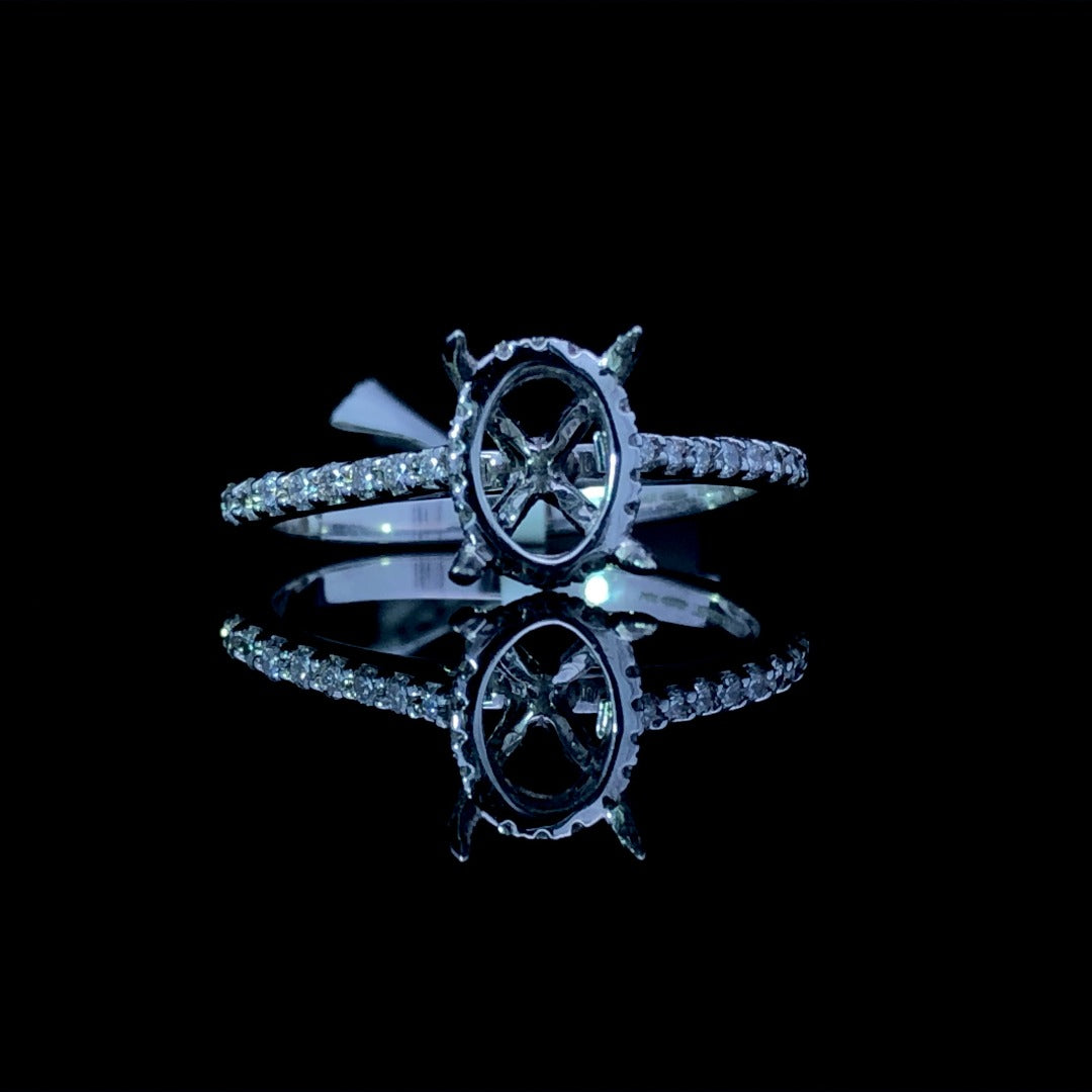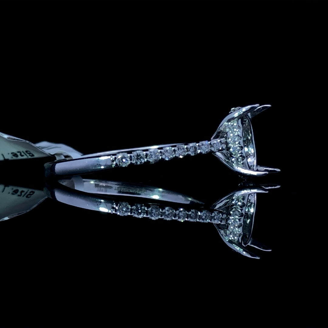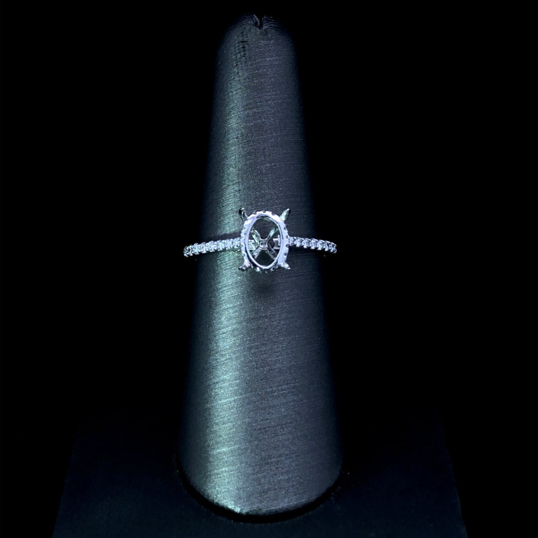 This beautiful diamond semi mount sparkles with a hidden halo and round diamond accents down the band. Crafted with 14kt white gold, it is the perfect setting for a show-stopping oval stone of your choice. Let your favorite gem shine with a total weight of .26ctw! Price is for the semi mount only. Center stone will be added at an additional cost. This ring is a size 7. If that size is not a perfect fit, first time sizing is free at the time of purchase. Additional sizing fees may apply.