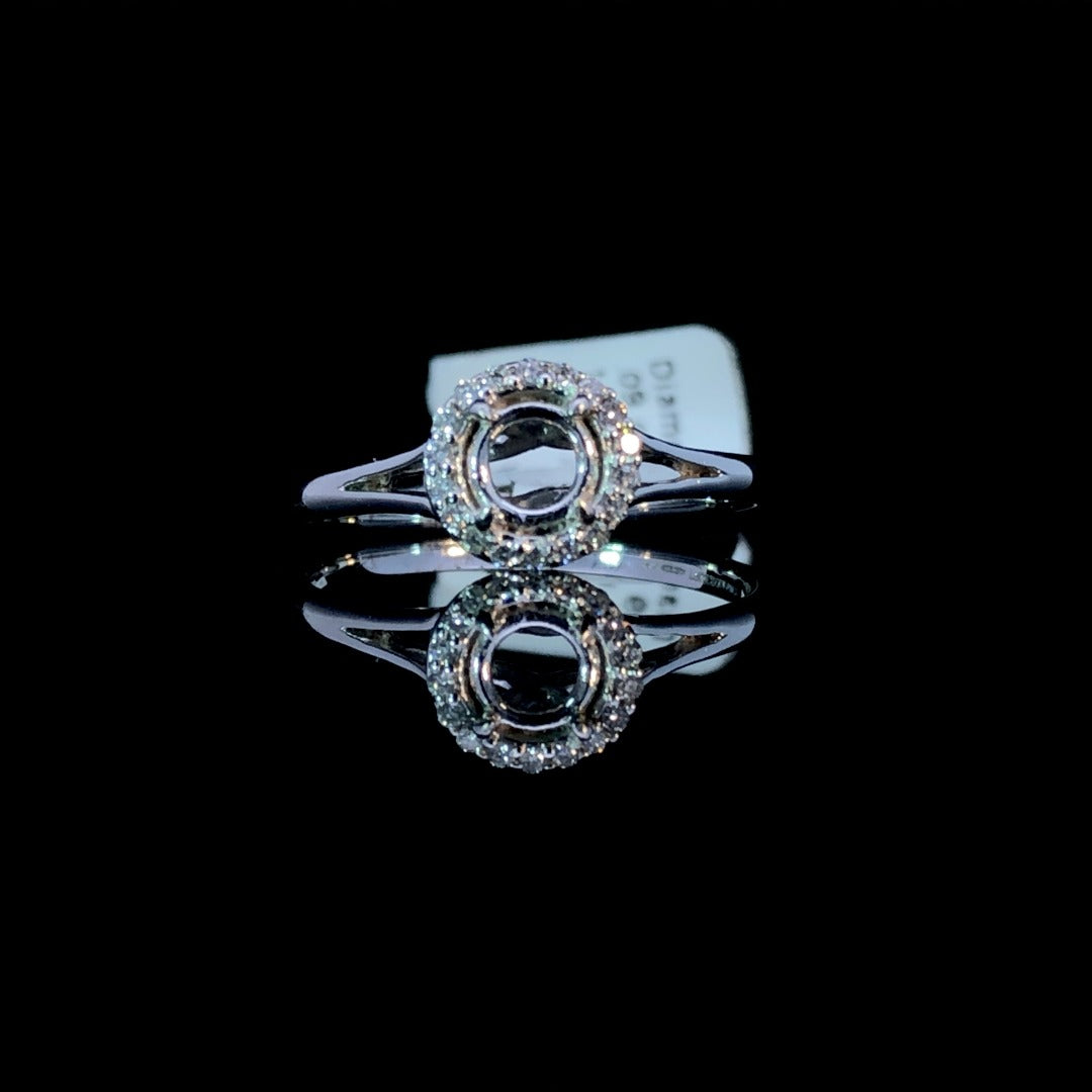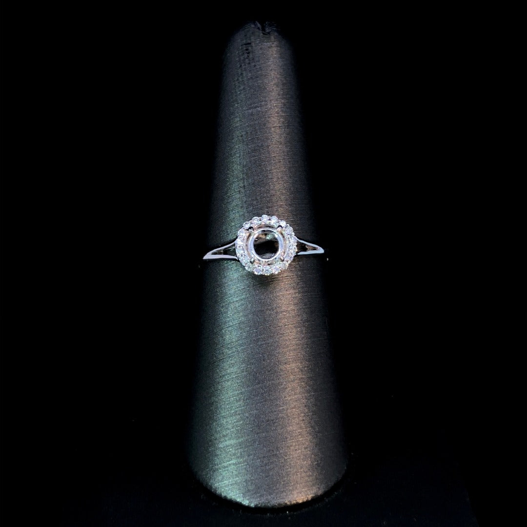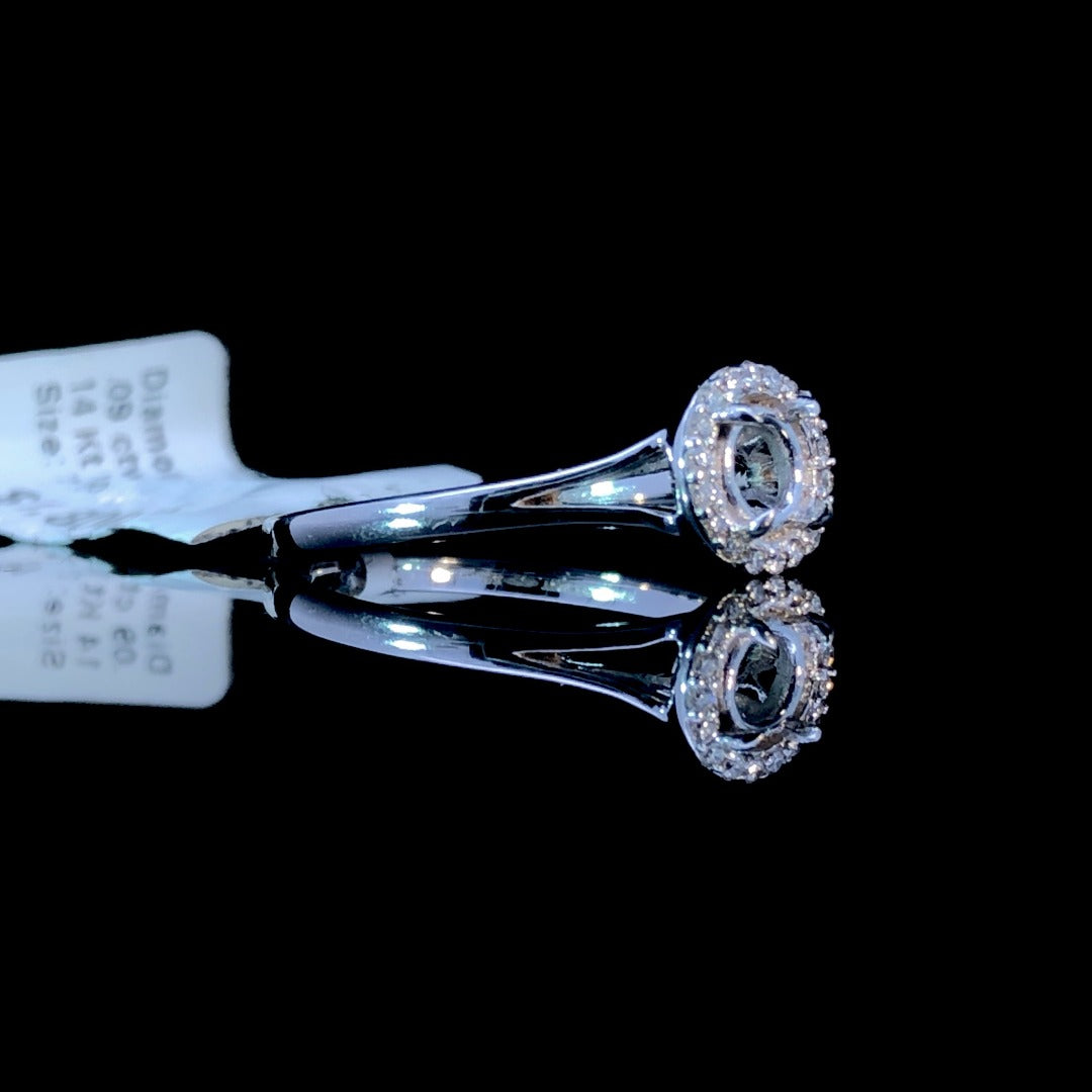 This stunning diamond semi mount features a timeless round halo design, adorned with .09ctw of round diamonds on a sleek 14kt white gold band. Personalize it with your choice of center stone from our wide range of loose stones. Elevate any look with this elegant and customizable piece! Price is for the semi mount only. Center stone will be added at an additional cost. This ring is a size 7. If that size is not a perfect fit, first time sizing is free at the time of purchase. Additional sizing fees may apply.
