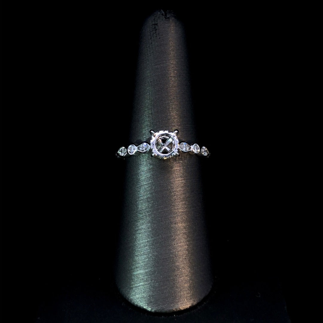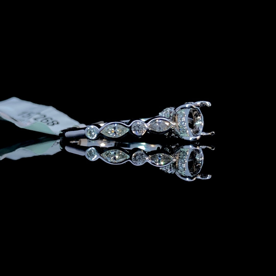 Get ready to add some chic elegance to your jewelry collection with our 14kt white gold semi mount featuring a hidden halo and decorative band. With alternating round and marquise diamond shapes totaling .54ctw, this piece is the perfect way to showcase your favorite round center stone from our unbeatable selection. Elevate your style with this stunning piece today! Price is for the semi mount only. Center stone will be added at an additional cost. This ring is a size 7. If that size is not a perfect fit, first time sizing is free at the time of purchase. Additional sizing fees may apply.