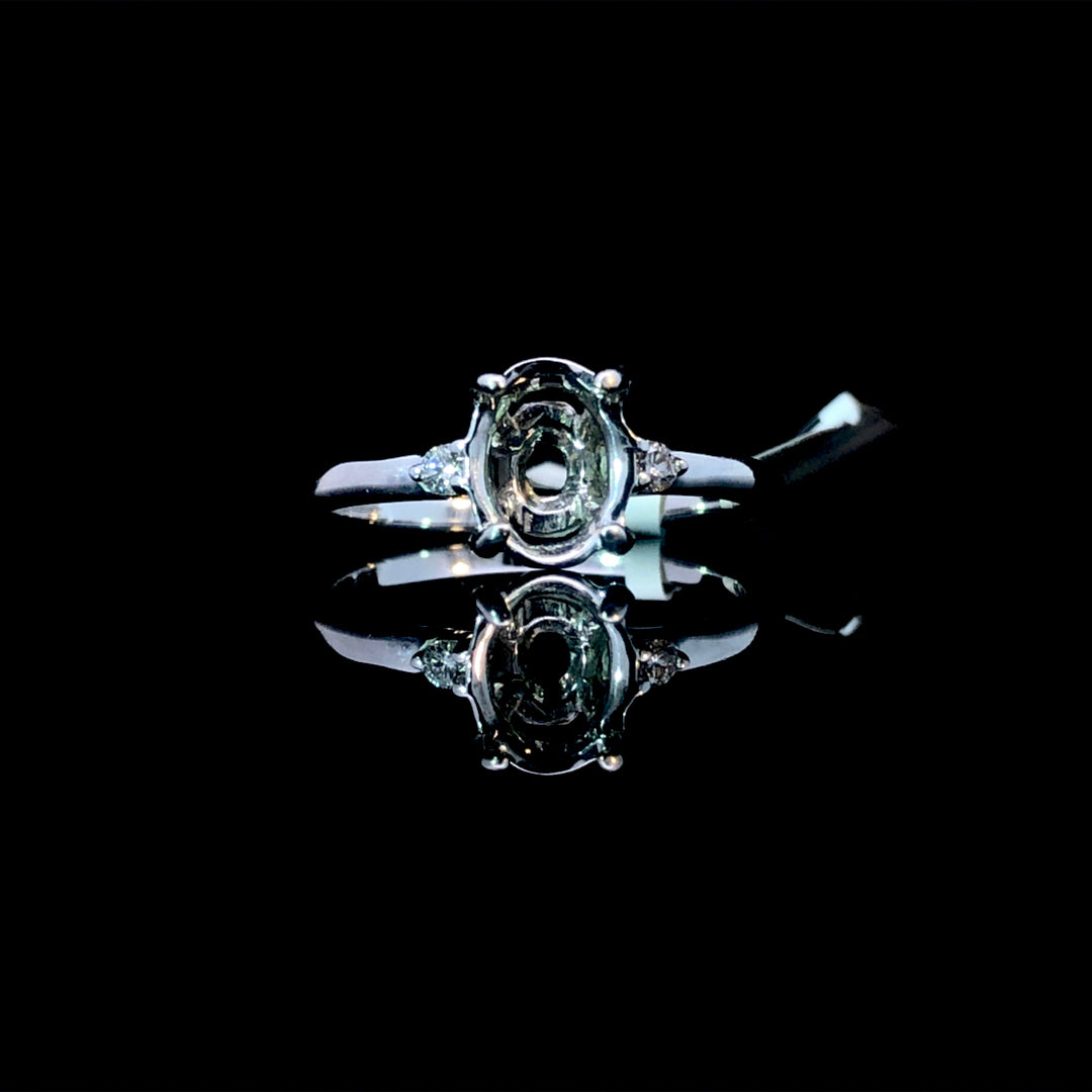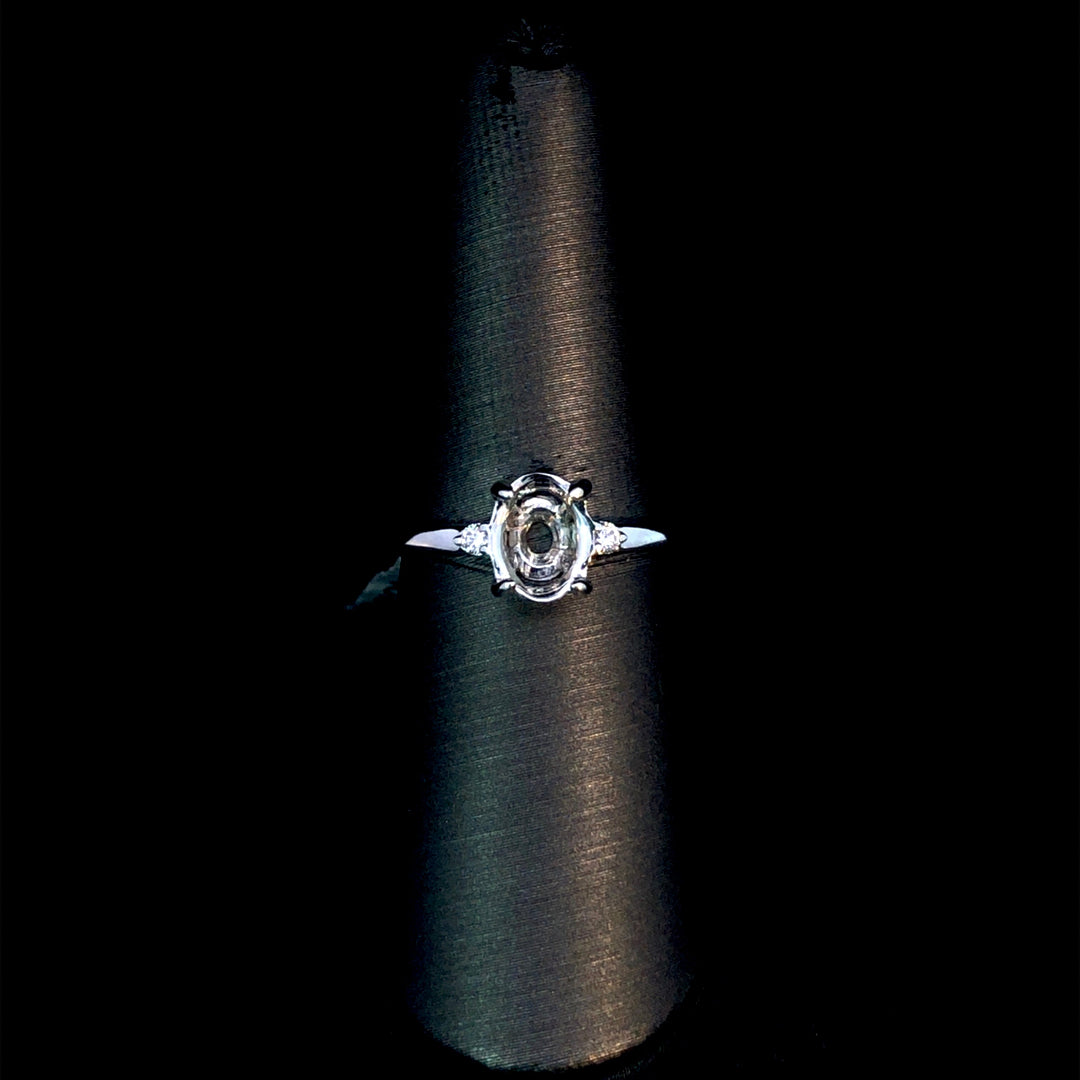 This 14kt white gold semi mount is thoughtfully designed to highlight your chosen oval center stone. Featuring two delicate round diamond side stones totaling 0.07ctw, it blends classic elegance with personalized potential. The oval-shaped head perfectly frames the center stone you select from our wide loose stone collection, allowing you to create a meaningful and beautiful ring tailored just for you. Price is for the semi mount only. Center stone will be added at an additional cost. This ring is a size 7. If that size is not a perfect fit, first time sizing is free at the time of purchase. Additional sizing fees may apply.