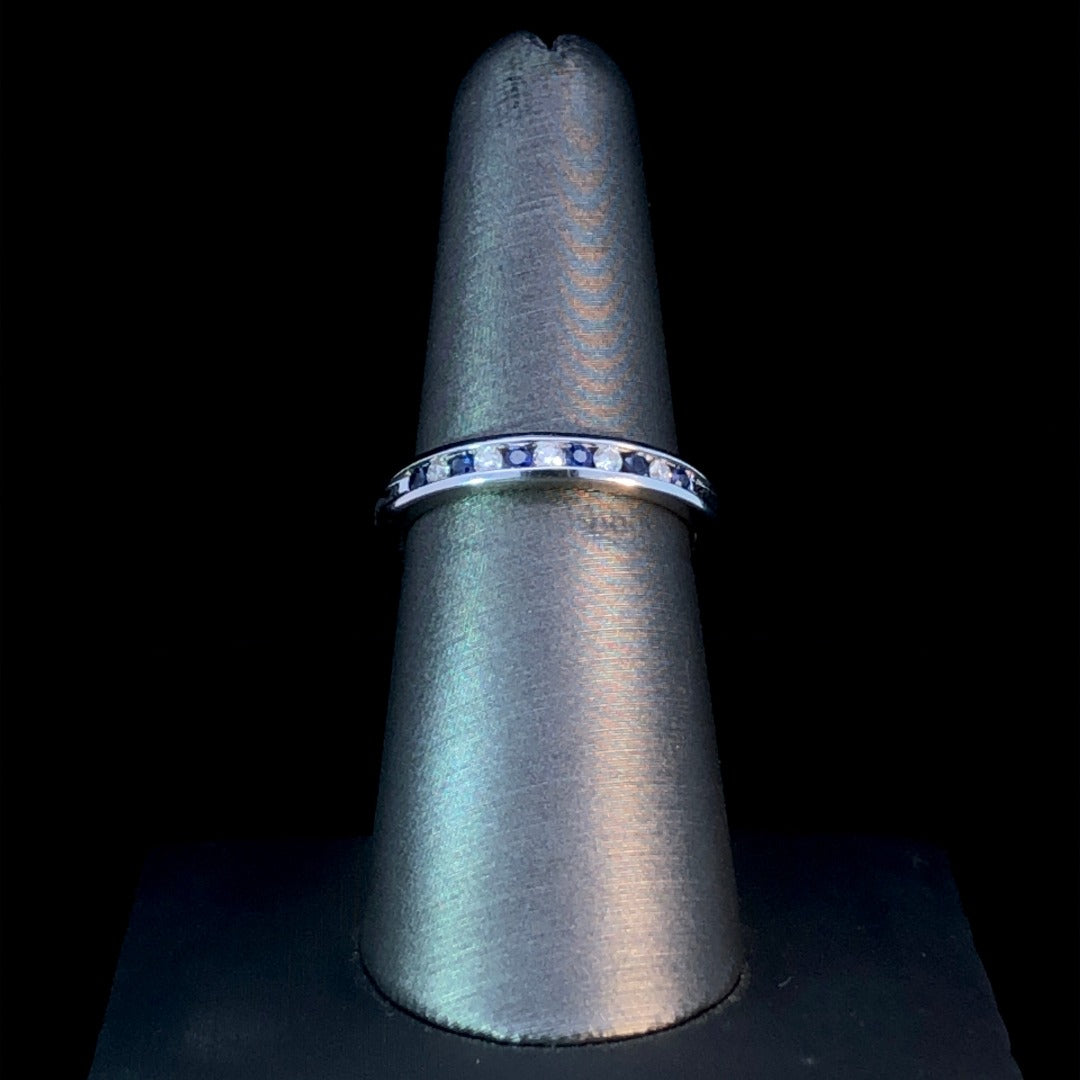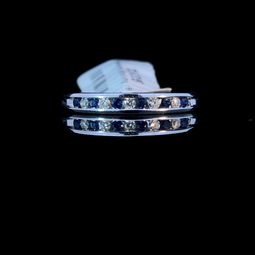 This exquisite 14kt white gold band exudes a subtle sophistication with its alternating pattern of round diamonds and sapphires, totaling .20ctw. An ideal choice for adding a spark of color while still maintaining a timeless elegance. This ring is a size 7. If that size is not a perfect fit, first time sizing is free at the time of purchase.