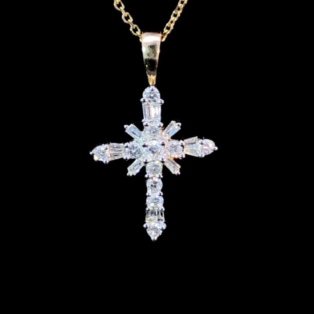 This stunning 14 kt yellow gold cross necklace by is adorned with a stunning .50 ctw of round and baguette diamonds. Carefully crafted and featuring expert diamond setting, this piece is sure to be cherished. Chain is not included.