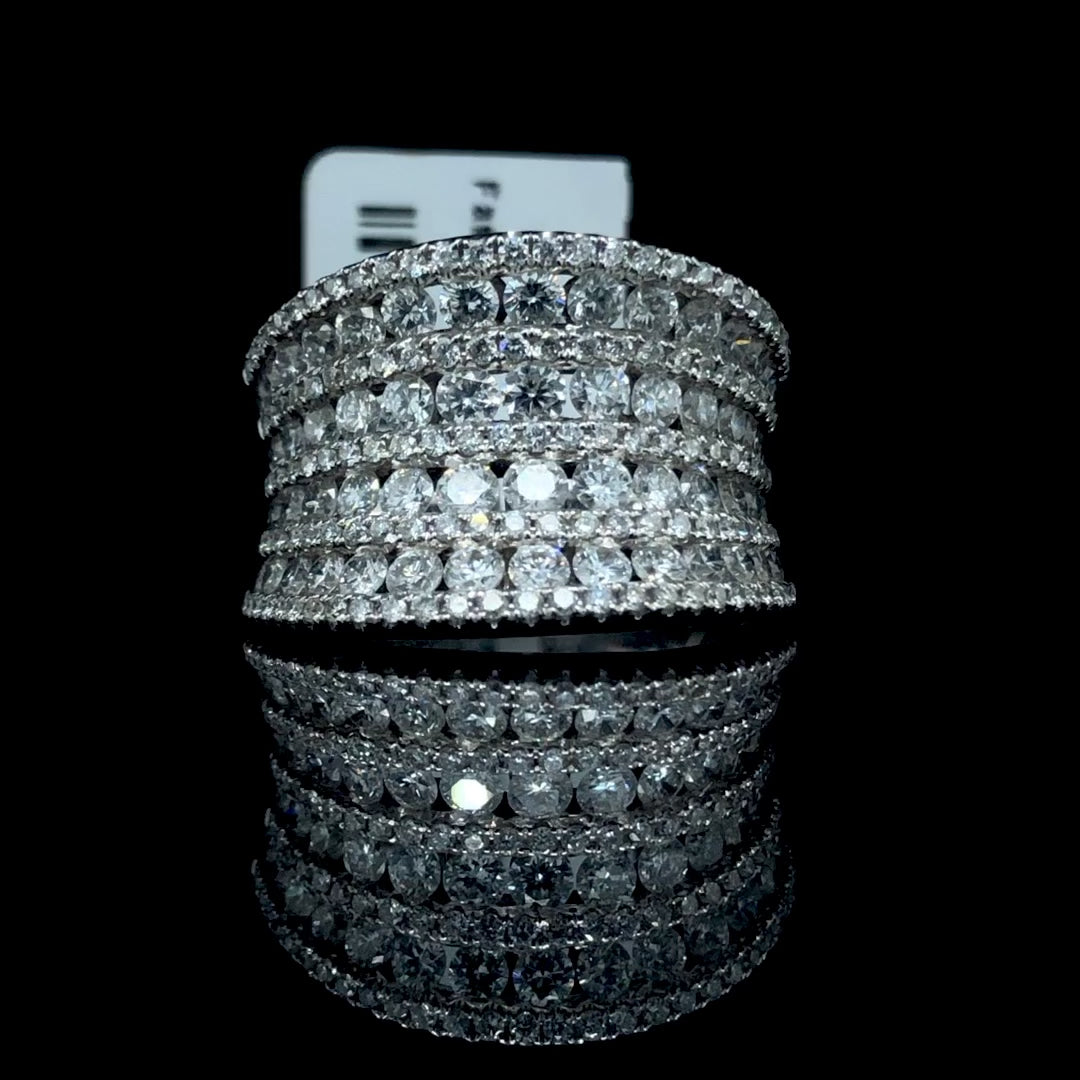 Dazzle in luxury with this exquisite 18kt white gold band. Its concave style and multi row feature 2.71ctw of dazzling diamonds. Experience opulence and elegance with every step. Who could resist such lustrous beauty? This ring is a size 6.5. If that size is not a perfect fit, first time sizing is free at the time of purchase. Additional sizing fees may apply.