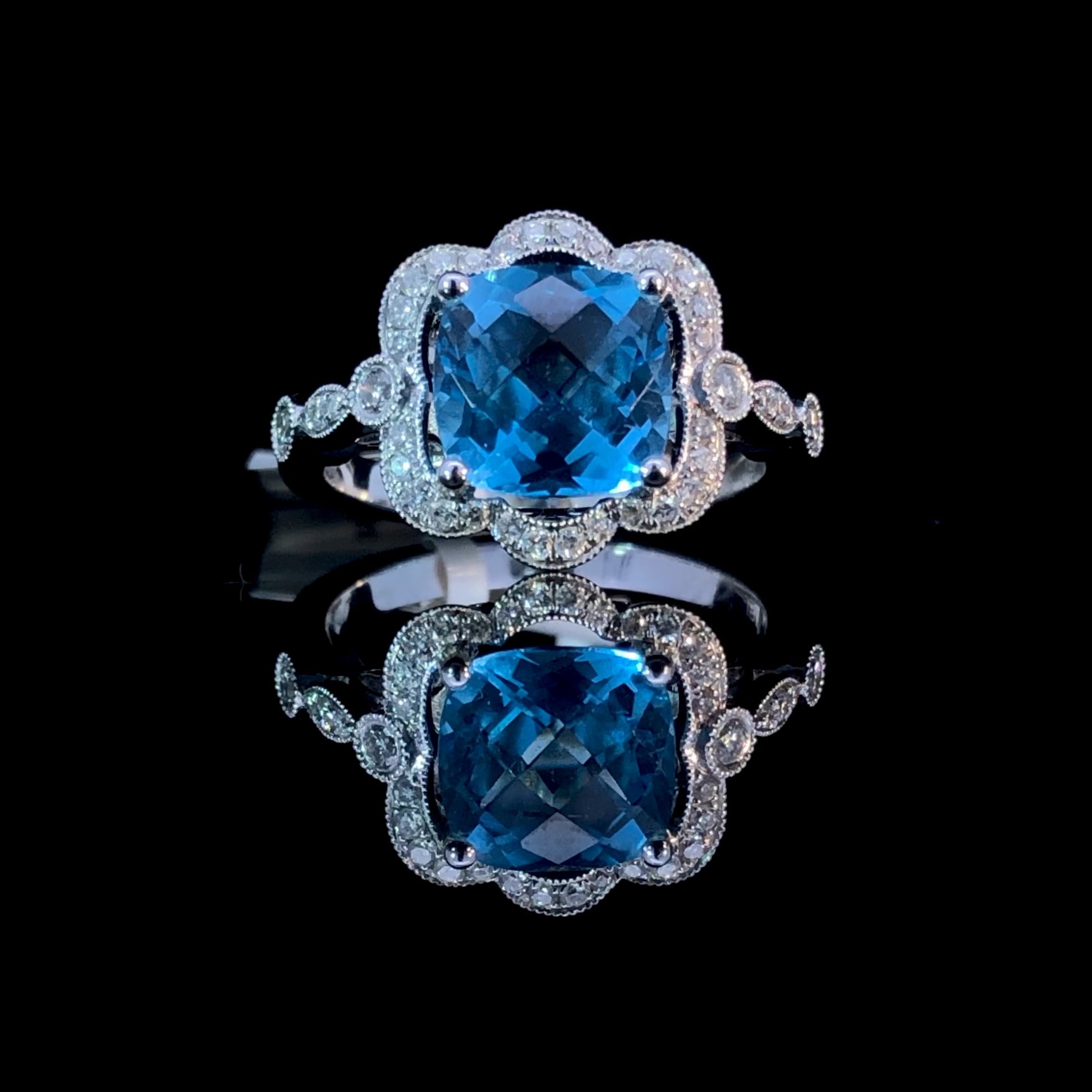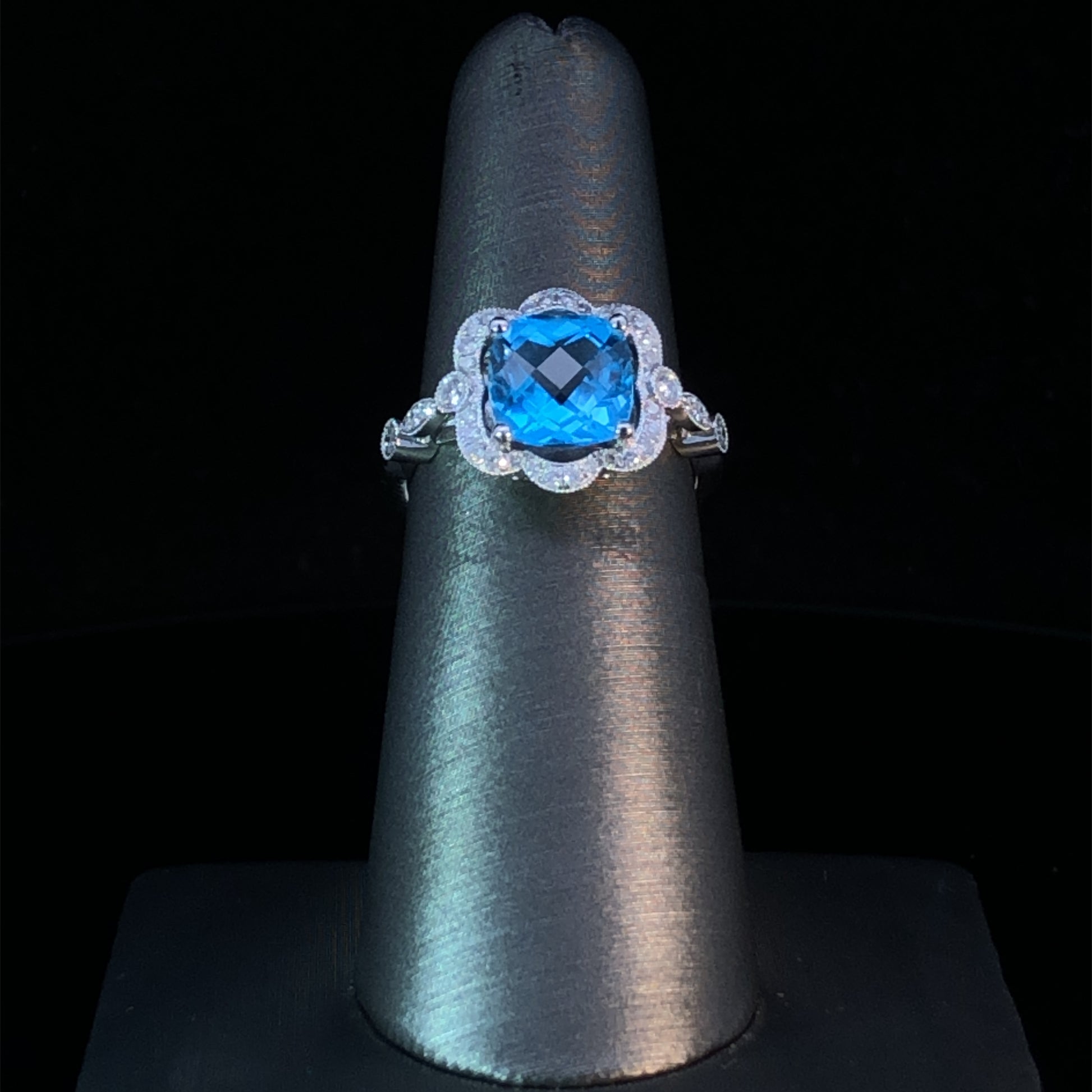Make a bold statement with this breathtaking blue topaz ring! Crafted with a stunning 2.82 ct cushion cut blue topaz framed in sparkling .29 ctw diamonds, set in a 14 kt white gold mounting. This captivating design will take you from day to night in classic elegance and timeless style. This ring is a size 7. If that size is not a perfect fit, first time sizing is free at the time of purchase.