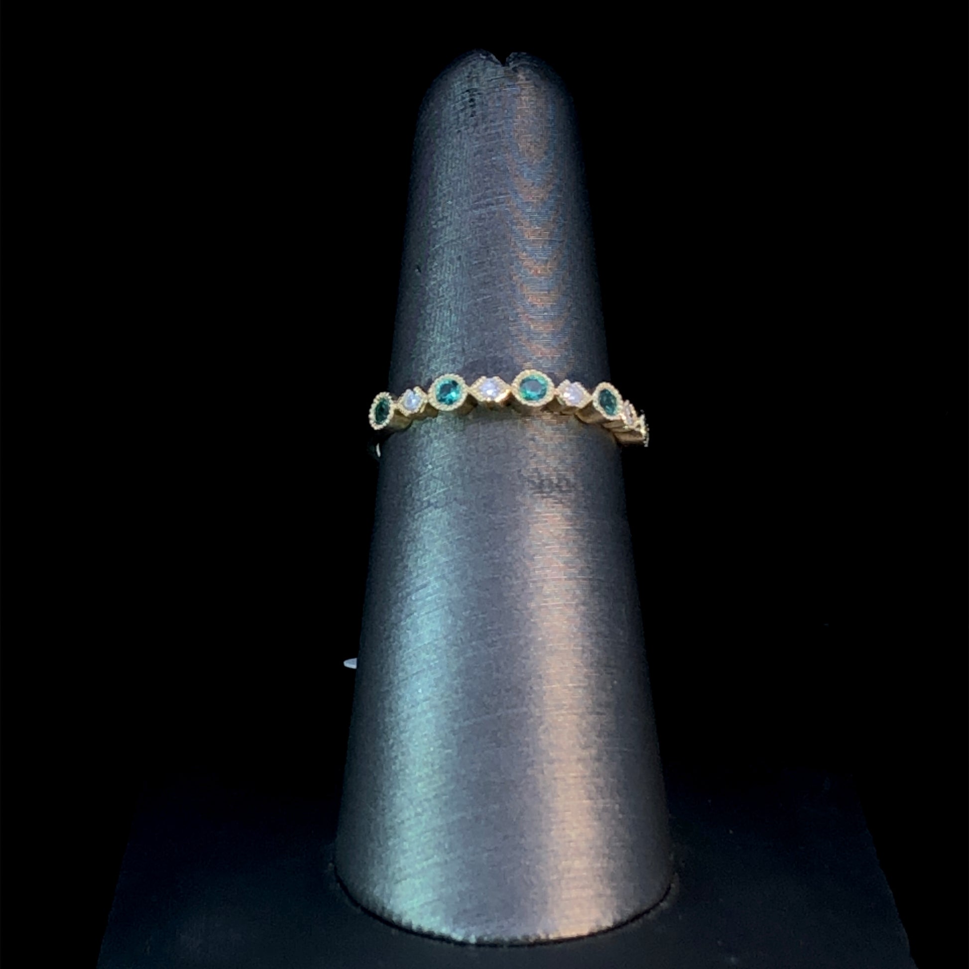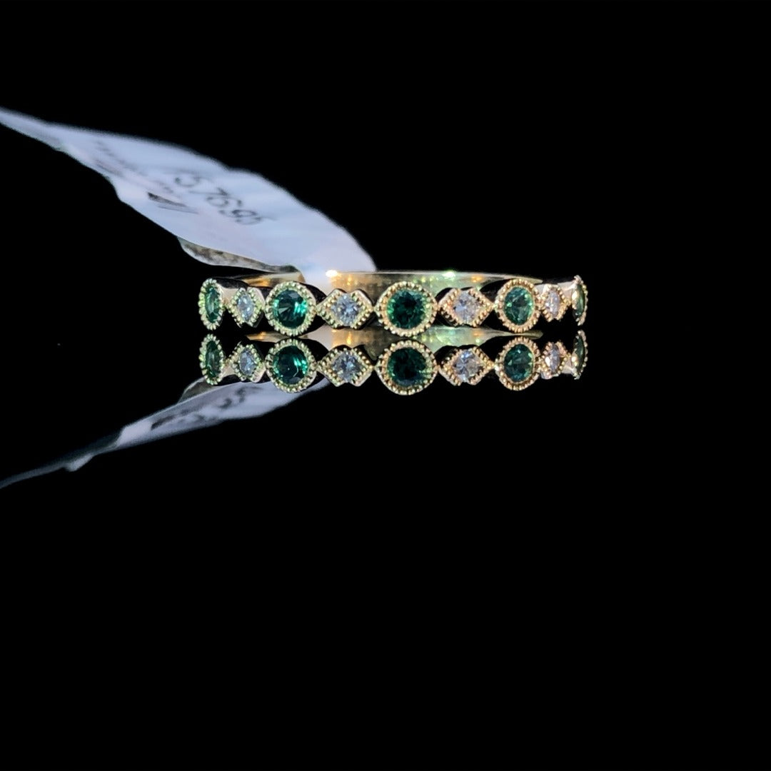 Make a stunning statement with this alluring 14kt yellow gold band. Filled with an exquisite combination of .16ctw of round emeralds and .07ctw of round diamonds, delicately set in a decorative milgrain design, this piece adds sparkle and sophistication to any ensemble! This ring is a size 6. If that size is not a perfect fit, first time sizing is free at the time of purchase. Additional sizing fees may apply.