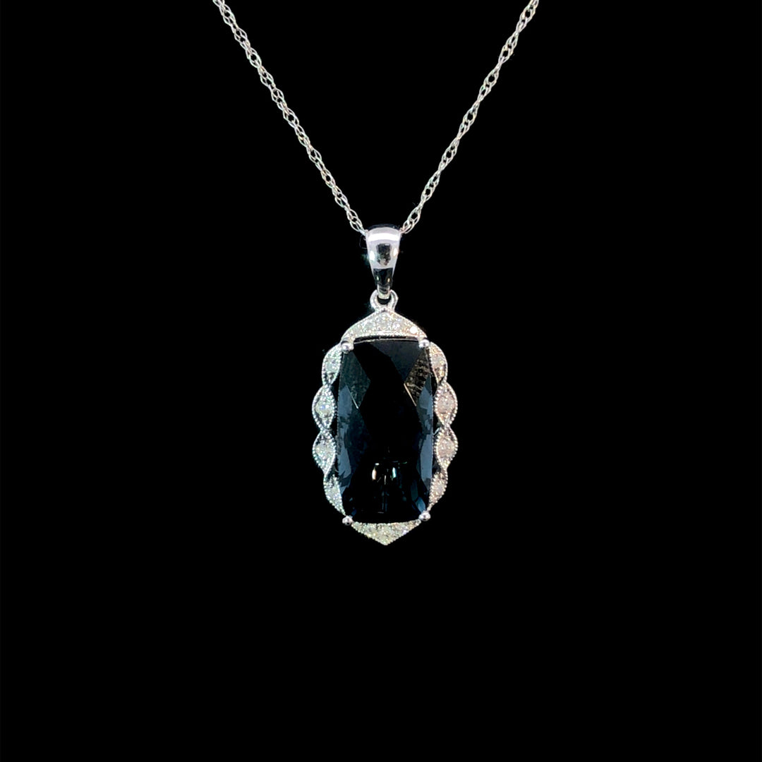 Elevate your style with this stunning pendant featuring a 7.28ct London blue topaz. The intricate halo design, adorned with .12ctw of round diamond accents, adds a touch of glamour to the 14kt white gold setting. Make a statement with this unique piece. Chain is not included.