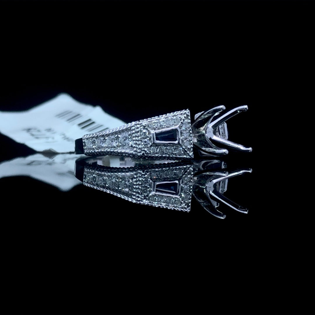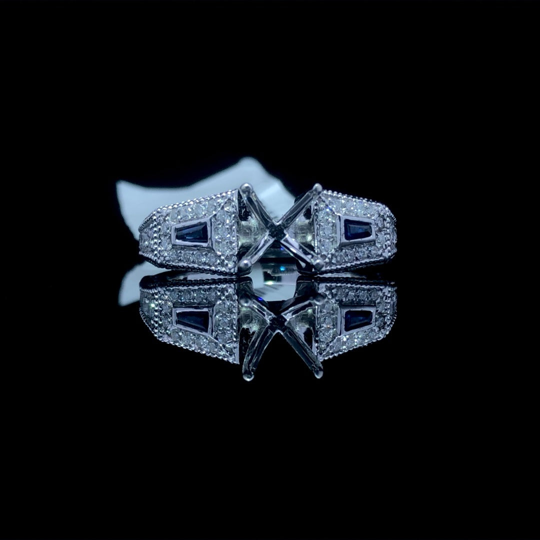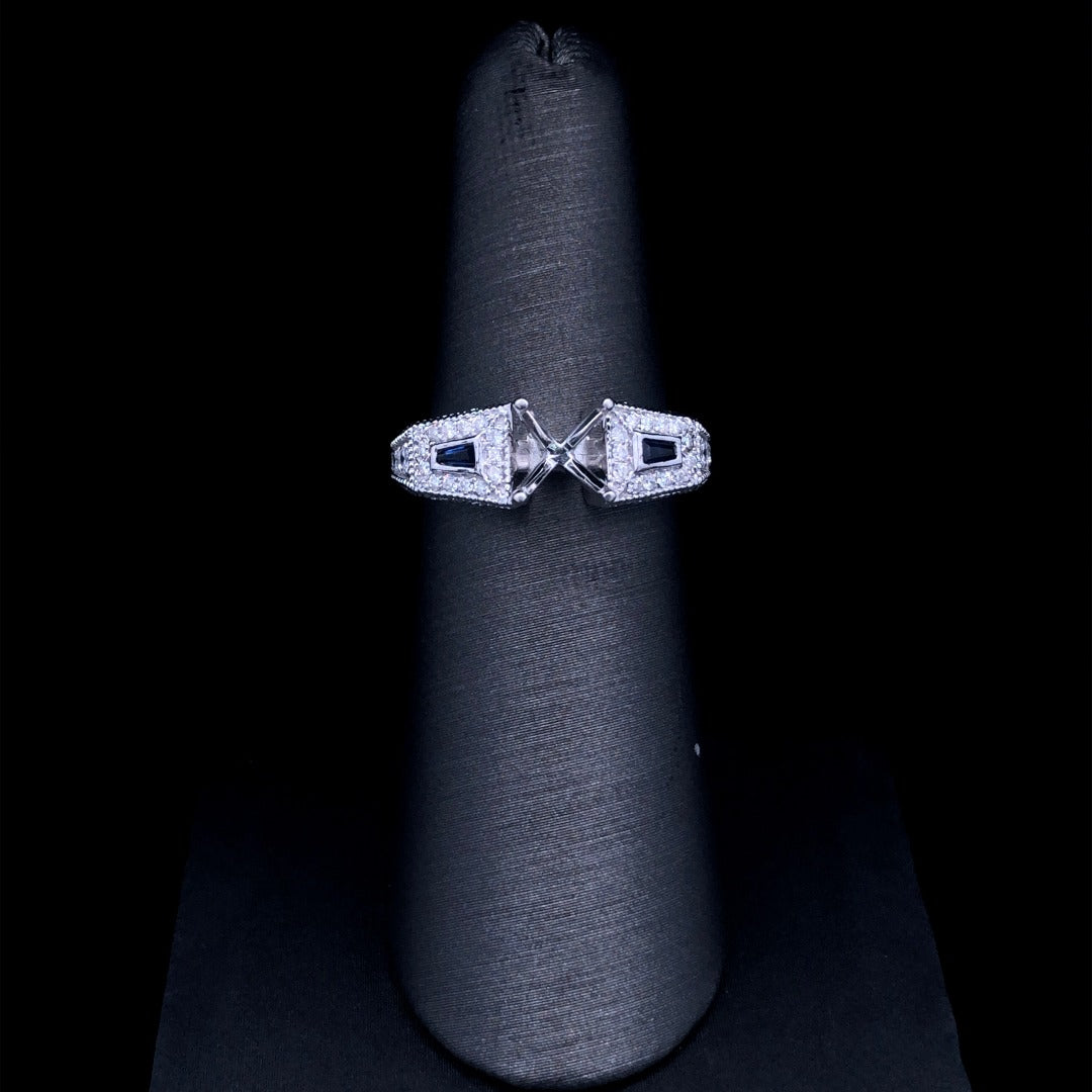 Add a personal touch to your jewelry collection with this gorgeous diamond and sapphire semi mount. Featuring .75ctw of round diamonds and .10ctw of baguette sapphire side stones set in 14kt white gold, this stunning piece is customizable with the center stone of your choice. Browse our selection of loose stones to find the perfect fit! Price is for the semi mount only. Center stone will be added at an additional cost. This ring is a size 7. If that size is not a perfect fit, first time sizing is free at the time of purchase. Additional sizing fees may apply.
