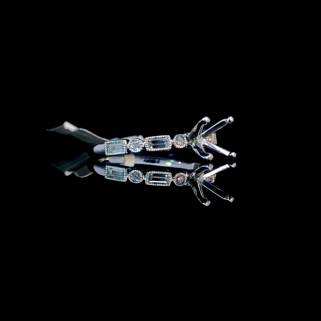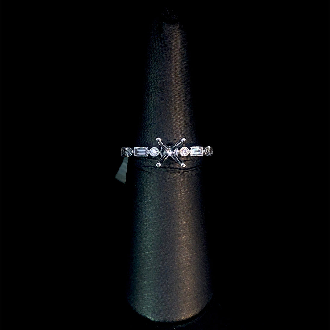 This elegant semi mount showcases .26ctw of round and baguette diamonds arranged in a striking alternating pattern along the band, enhanced with delicate milgrain detailing. Crafted in 14kt white gold, this versatile setting invites you to select your own center stone from our curated collection of loose diamonds, allowing you to create a truly personalized engagement ring that reflects your unique style. Price is for the semi mount only. Center stone will be added at an additional cost. This ring is a size 6.5. If that size is not a perfect fit, first time sizing is free at the time of purchase. Additional sizing fees may apply.