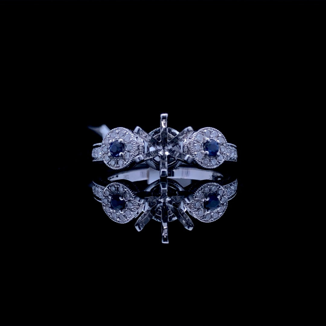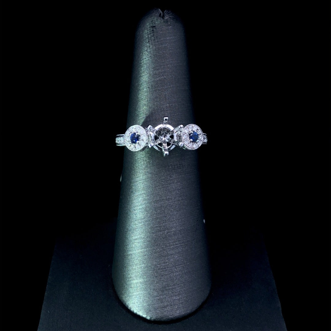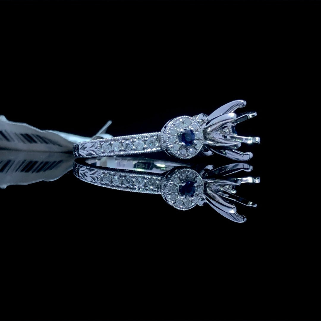 Add a touch of color to your collection with our stunning diamond and sapphire semi mount. Choose from our selection of loose stones for the center, while elegant side stones and diamond halos highlight the 14kt white gold band. Etching on the sides adds intricate detail. Elevate your look now! Price is for the semi mount only. Center stone will be added at an additional cost. This ring is a size 6. If that size is not a perfect fit, first time sizing is free at the time of purchase. Additional sizing fees may apply.