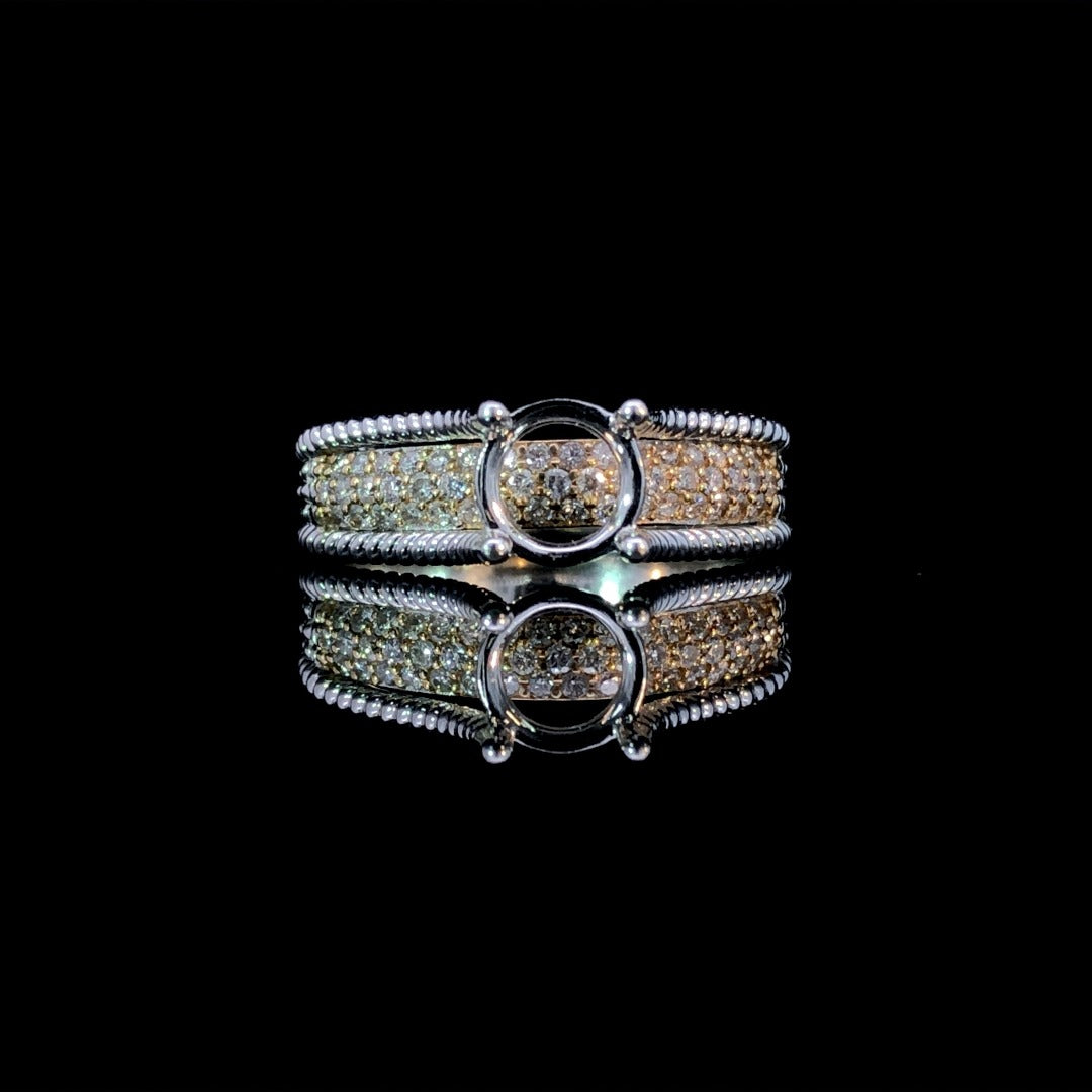 Add a touch of elegance with our gorgeous diamond semi mount. This stunning piece features a 2-tone design of 14kt white and yellow gold, with a central section adorned with .39ctw of round diamonds set in warm yellow gold. The outer edges boast a delicate white gold rope design for extra flair. Complete it with a round center stone of your choice for a truly unique and luxurious piece. Price is for the semi mount only. Center stone will be added at an additional cost. This ring is a size 6.5. If that size is not a perfect fit, first time sizing is free at the time of purchase. Additional sizing fees may apply.