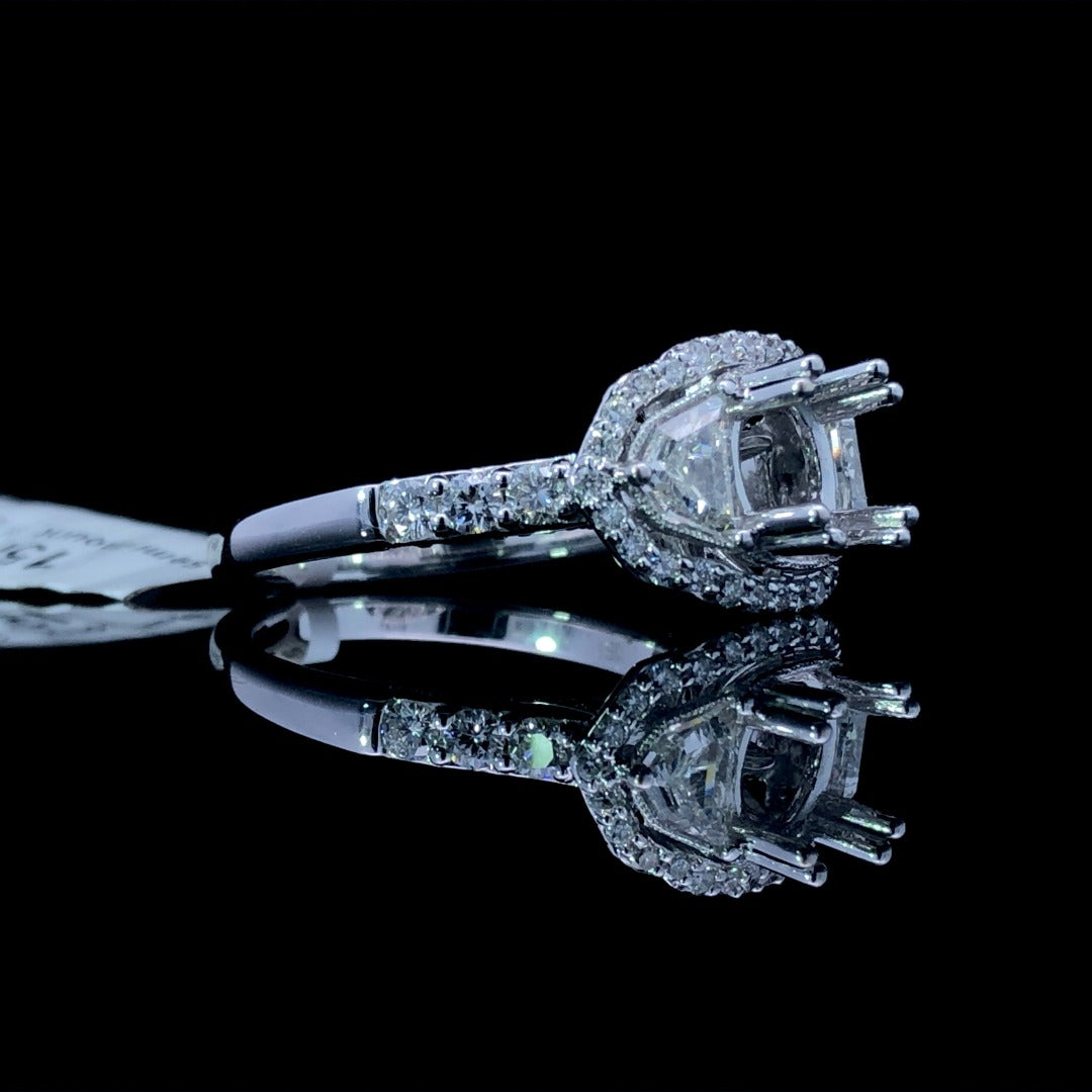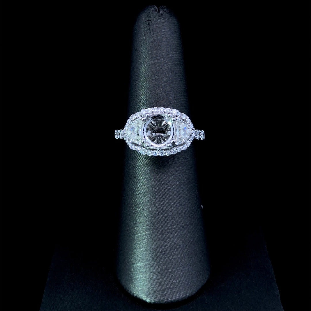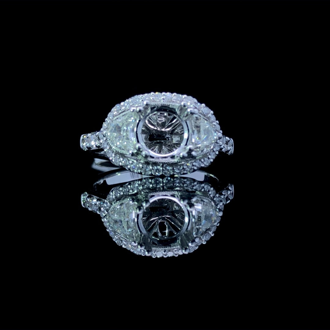 Elevate your style with our diamond semi mount. Featuring a unique design and an impressive diamond weight of 1.33ctw, this piece will surely catch anyone's eye. Choose from a variety of center stones from our selection to add your own personal touch. Crafted in 18kt white gold. Price is for the semi mount only. Center stone will be added at an additional cost. This ring is a size 6.5. If that size is not a perfect fit, first time sizing is free at the time of purchase. Additional sizing fees may apply.