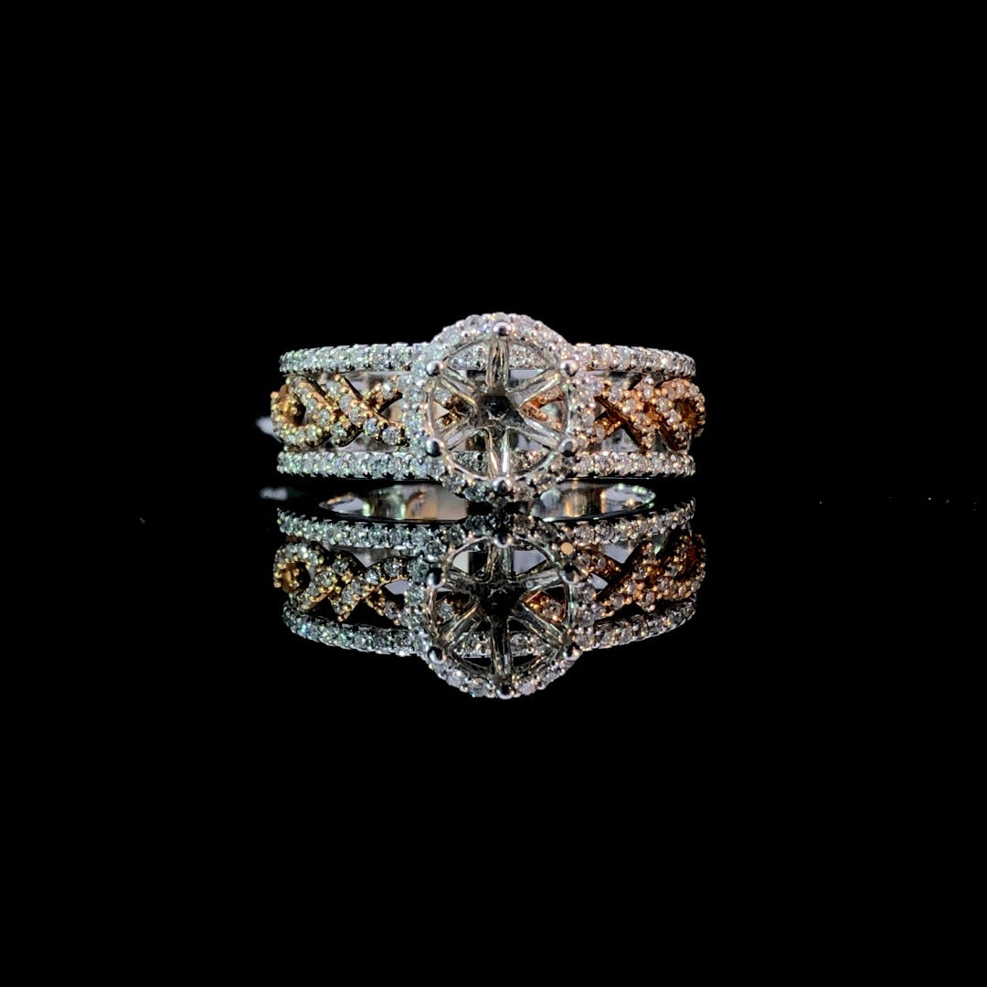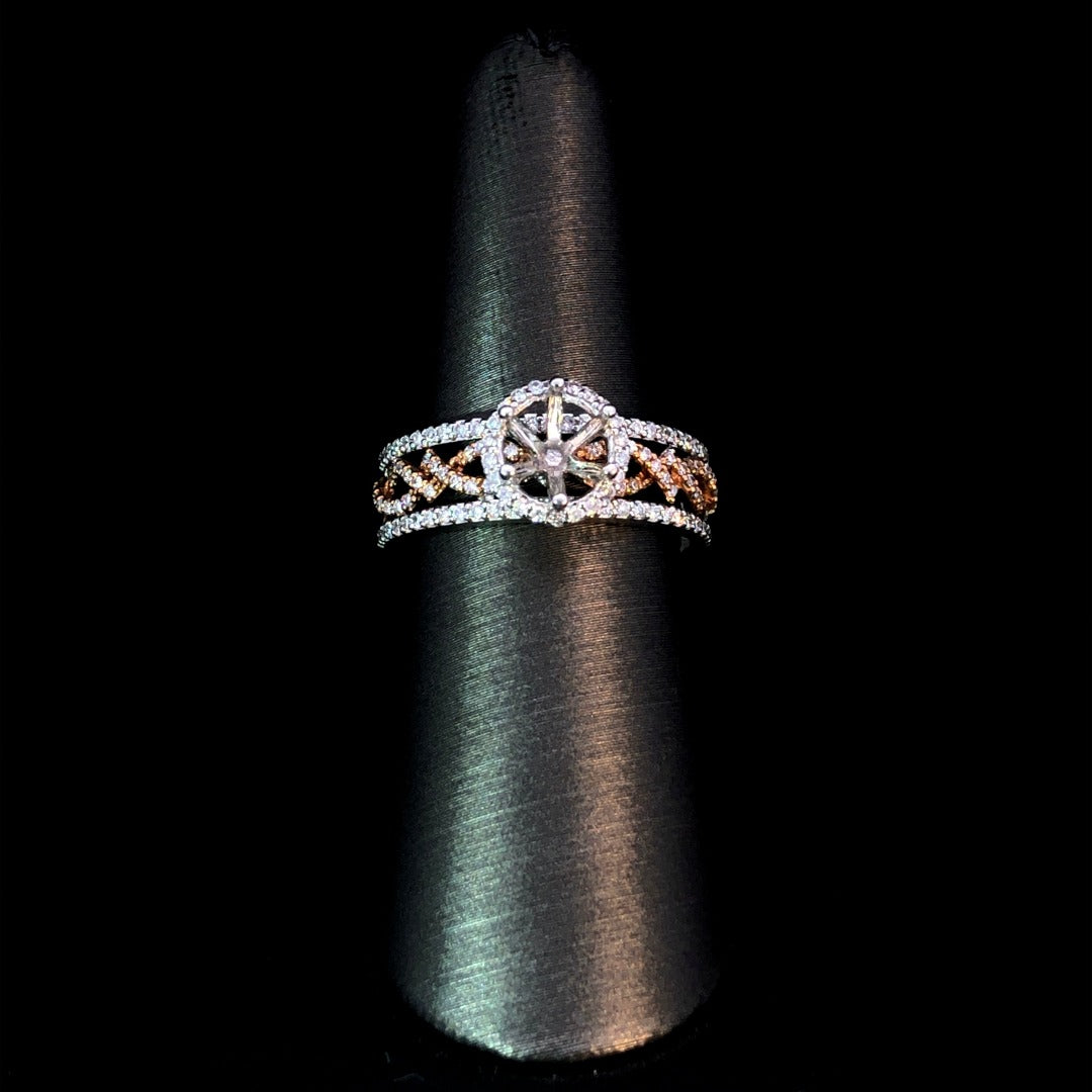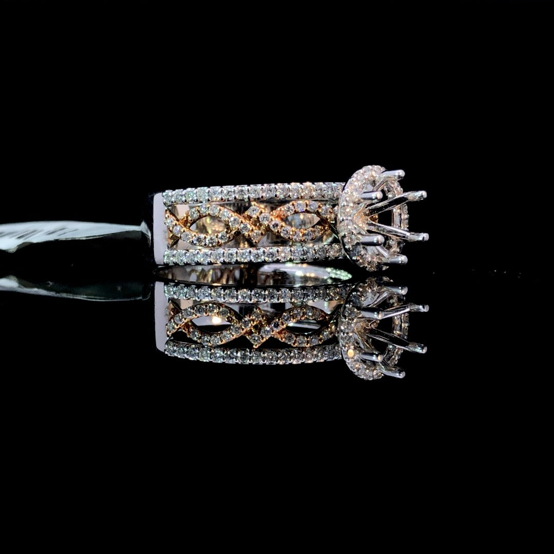 Indulge in elegance with our 14kt 2-tone gold diamond semi mount, featuring a white gold round halo and outer bands, and a stunning rose gold twist at the center. With .56ctw of sparkling round diamonds, this eye-catching design will surely make a statement. Choose from our selection of loose stones to complete this beautiful piece. Price is for the semi mount only. Center stone will be added at an additional cost. This ring is a size 7.25. If that size is not a perfect fit, first time sizing is free at the time of purchase. Additional sizing fees may apply.