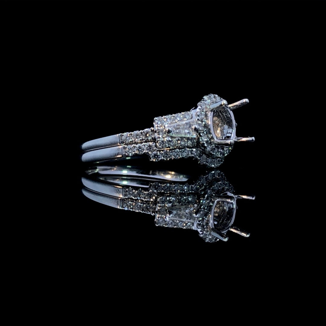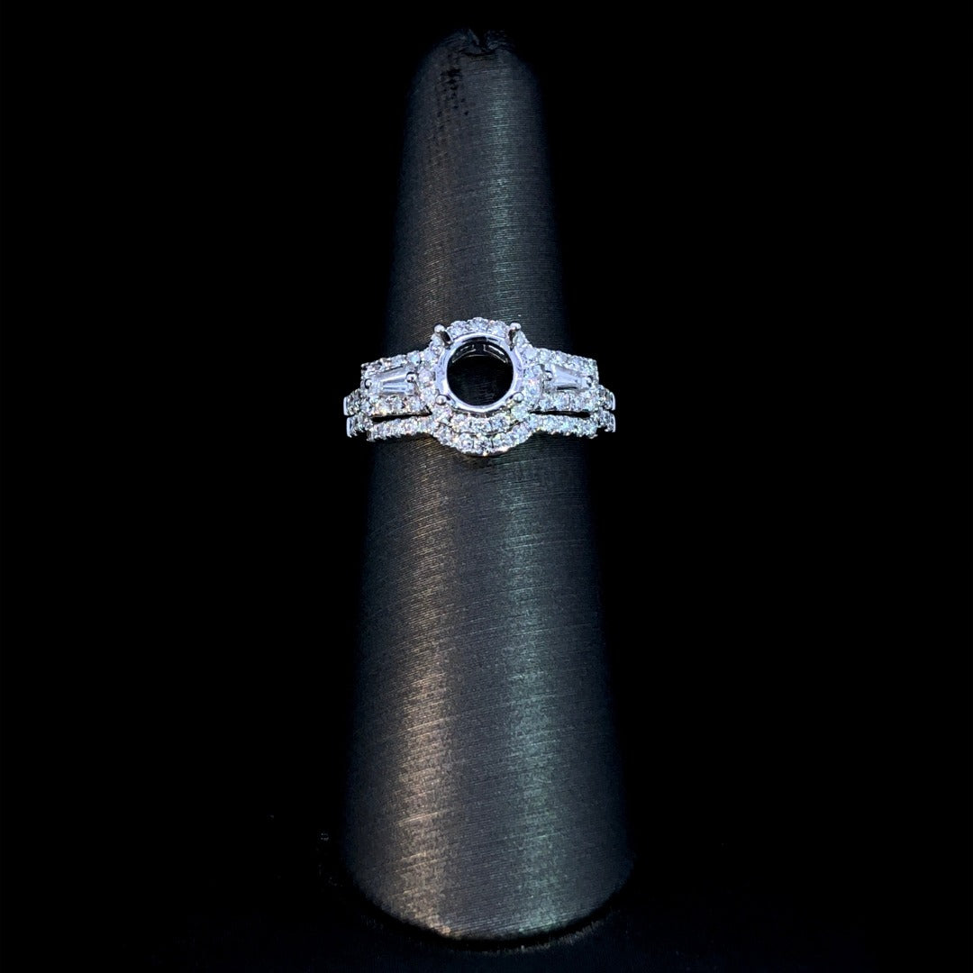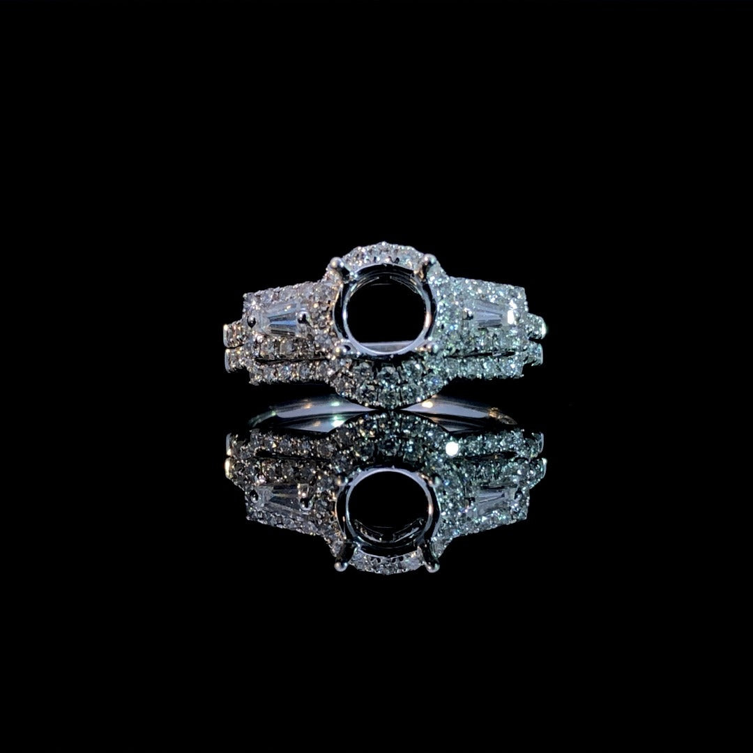 Indulge in luxury with this exquisite 14kt white gold diamond semi mount. Adorned with a stunning .60ctw of diamonds, including 2 baguette side stones and .39ctw of round diamond accents, this piece is an ode to true love. Choose your own center stone for a unique touch, and pair it with the matching diamond contour band (sold separately) for a complete set. Price is for the semi mount only. Center stone will be added at an additional cost. This ring is a size 6.5. If that size is not a perfect fit, first time sizing is free at the time of purchase. Additional sizing fees may apply.