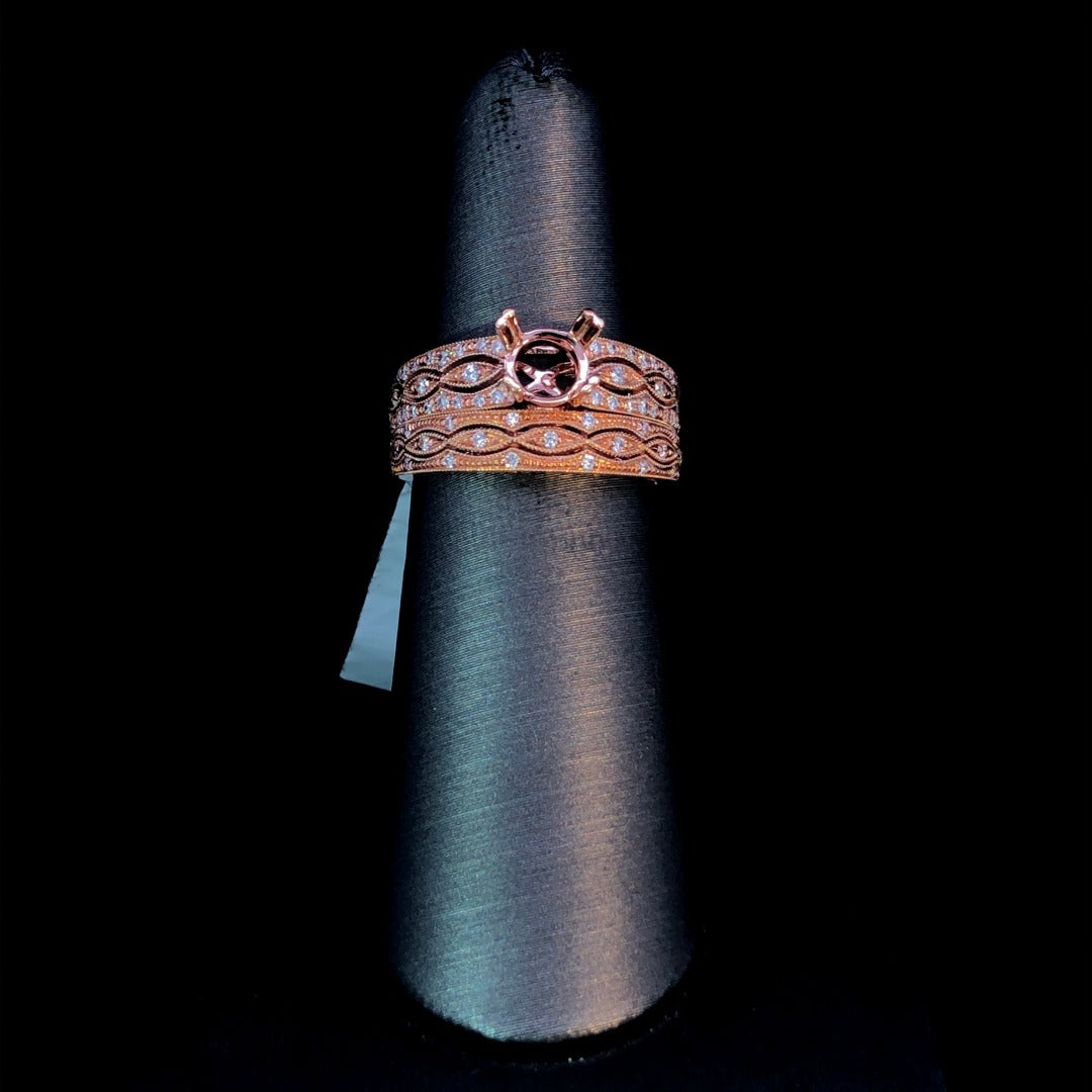Elevate your engagement with this stunning semi mount. Made with 14kt rose gold and .23ctw of sparkling diamond accents, it features a stunning filigree and milgrain design. Choose your own center stone from our vast selection and complete the look with the separately sold .12ctw diamond band for a captivating bridal set. Price is for the semi mount only. Center stone and band will be added at an additional cost. This ring is a size 6. If that size is not a perfect fit, first time sizing is free at the time of purchase. Additional sizing fees may apply.