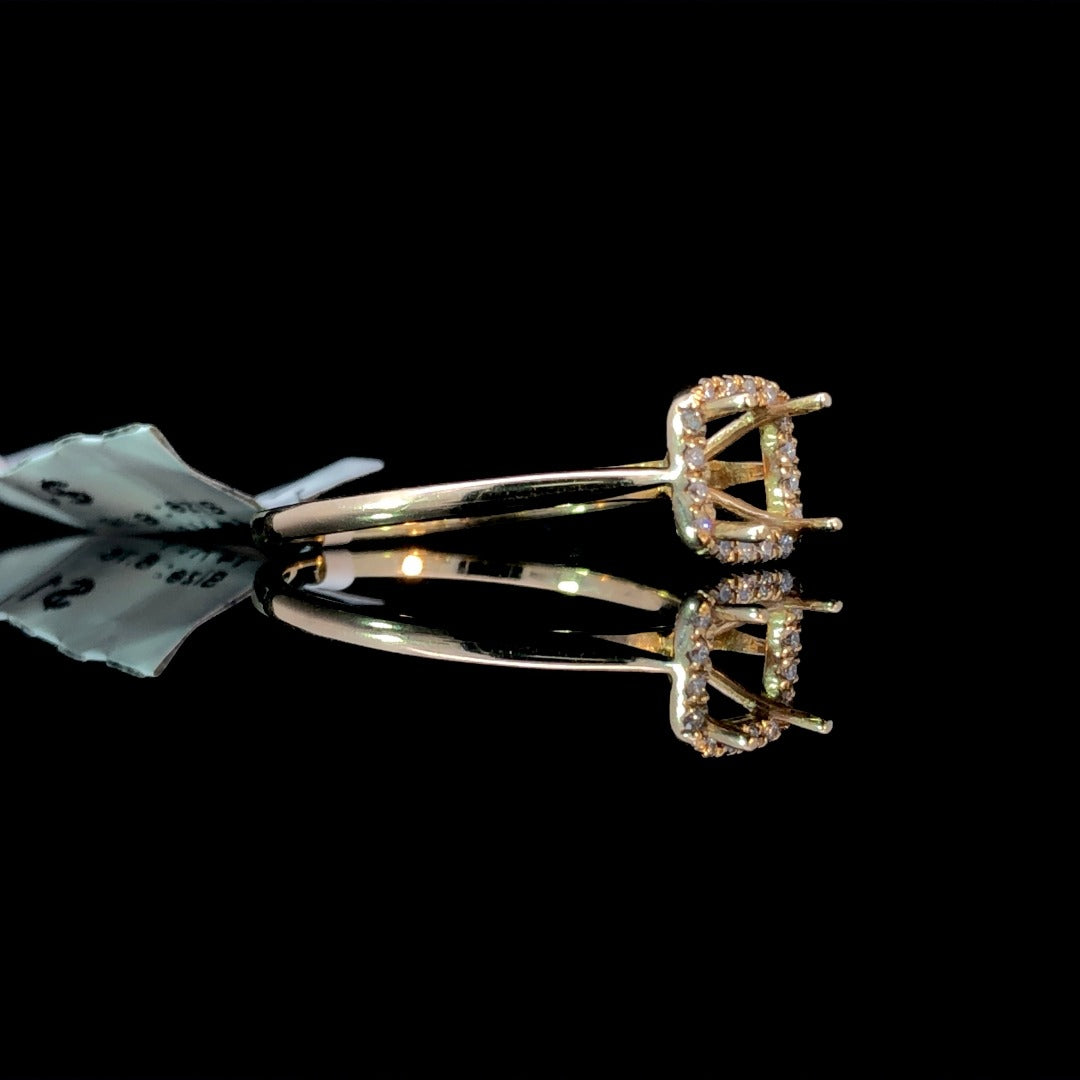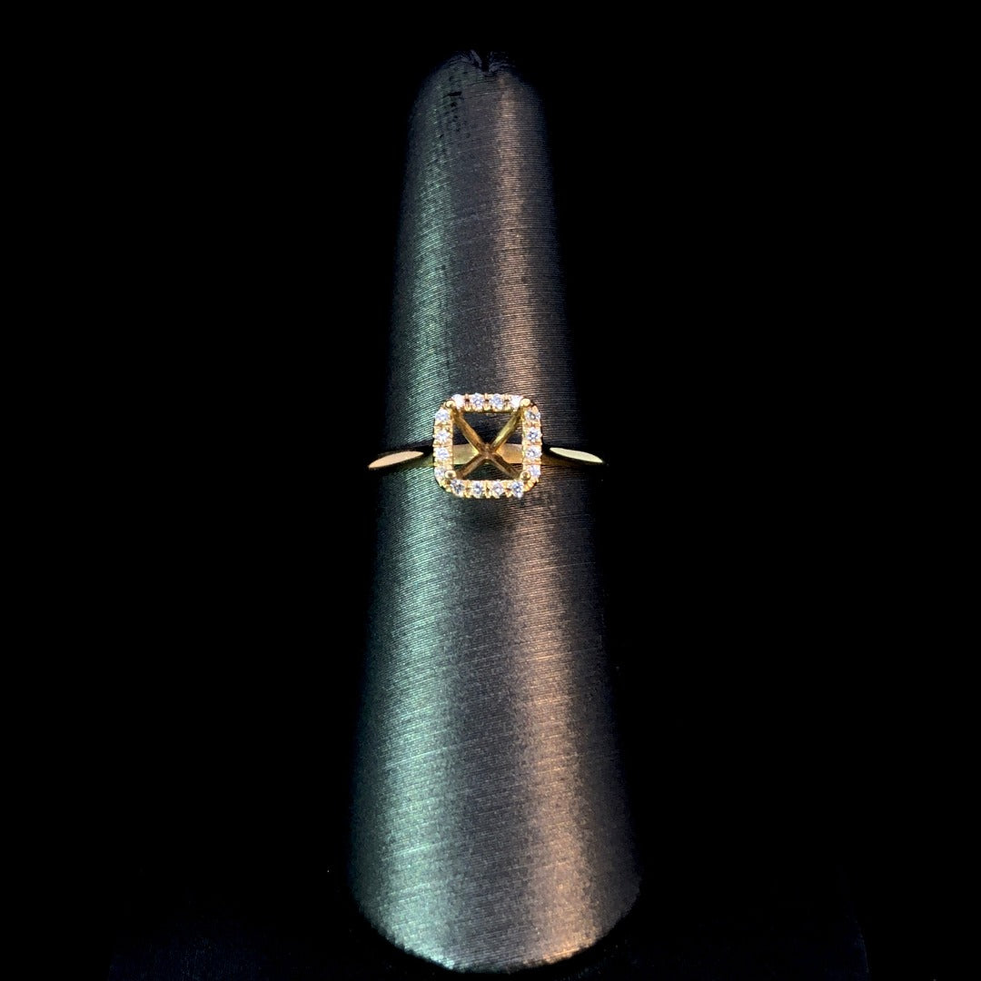 Indulge in the luxurious simplicity of this beautiful diamond semi mount. The cushion shaped halo design is adorned with sparkling round diamonds (.08ctw) in 14kt yellow gold. A delicate and stunning piece, perfect for adding a touch of elegance to any look! Price is for the semi mount only. Center stone will be added at an additional cost. This ring is a size 6.75. If that size is not a perfect fit, first time sizing is free at the time of purchase. Additional sizing fees may apply.