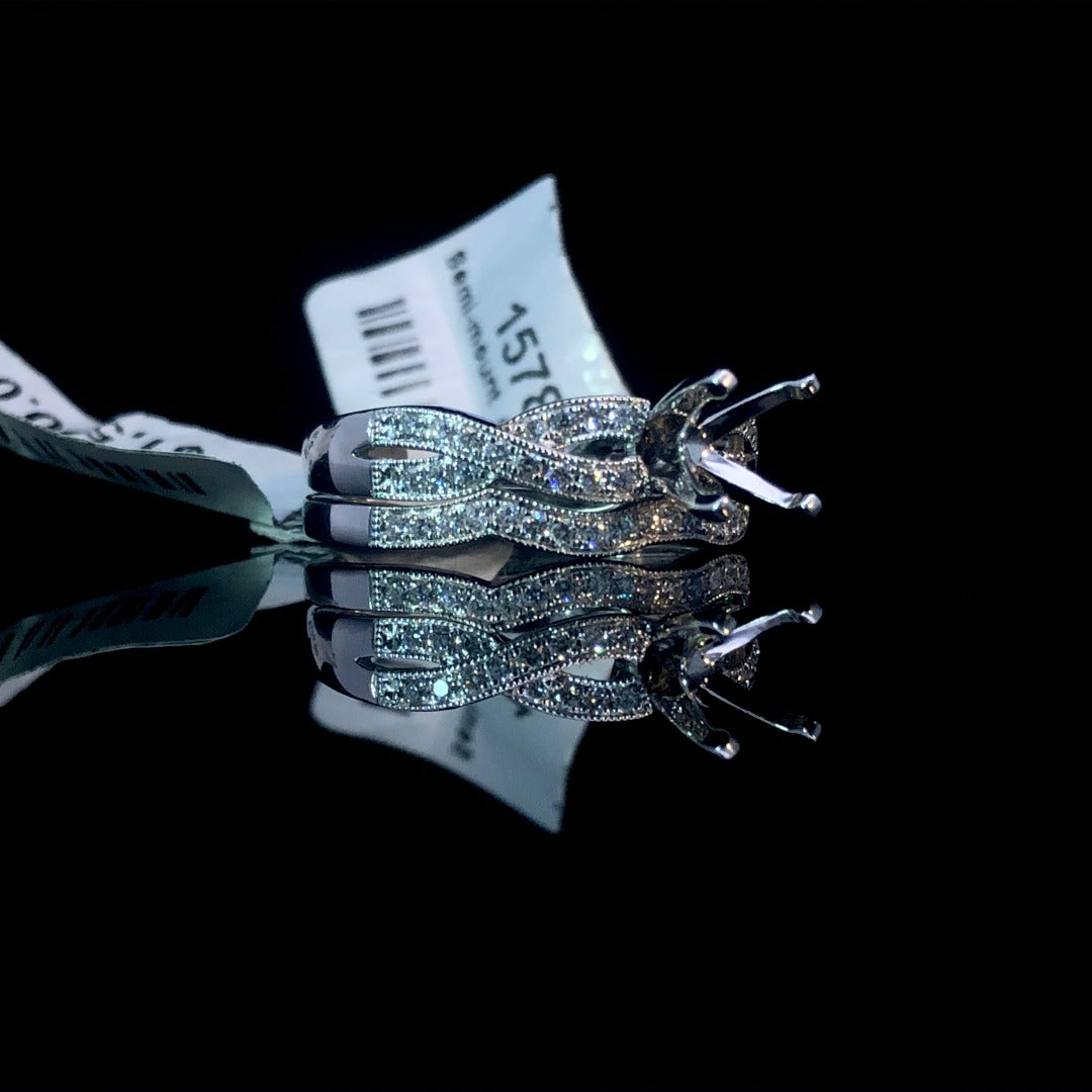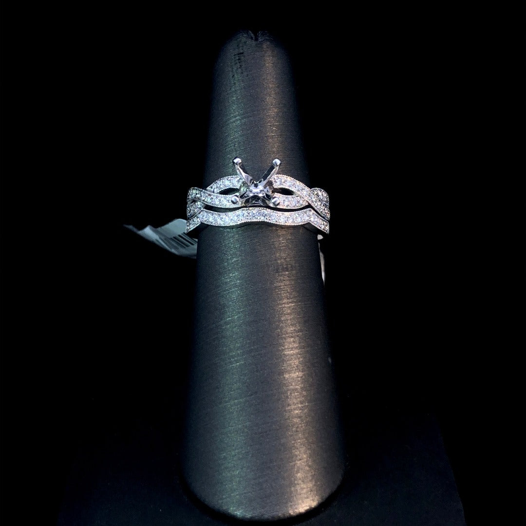 This gorgeous 14kt white gold semi mount features a twisted diamond band with .22ctw of round diamonds, creating a simple yet elegant design. Choose from our collection of loose stones to complete the look. Add the matching diamond contour band (sold separately) for a complete set. Price is for the semi mount only. Center stone will be added at an additonal cost. This ring is a size 6. If that size is not a perfect fit, first time sizing is free at the time of purchase. Additional sizing fees may apply.