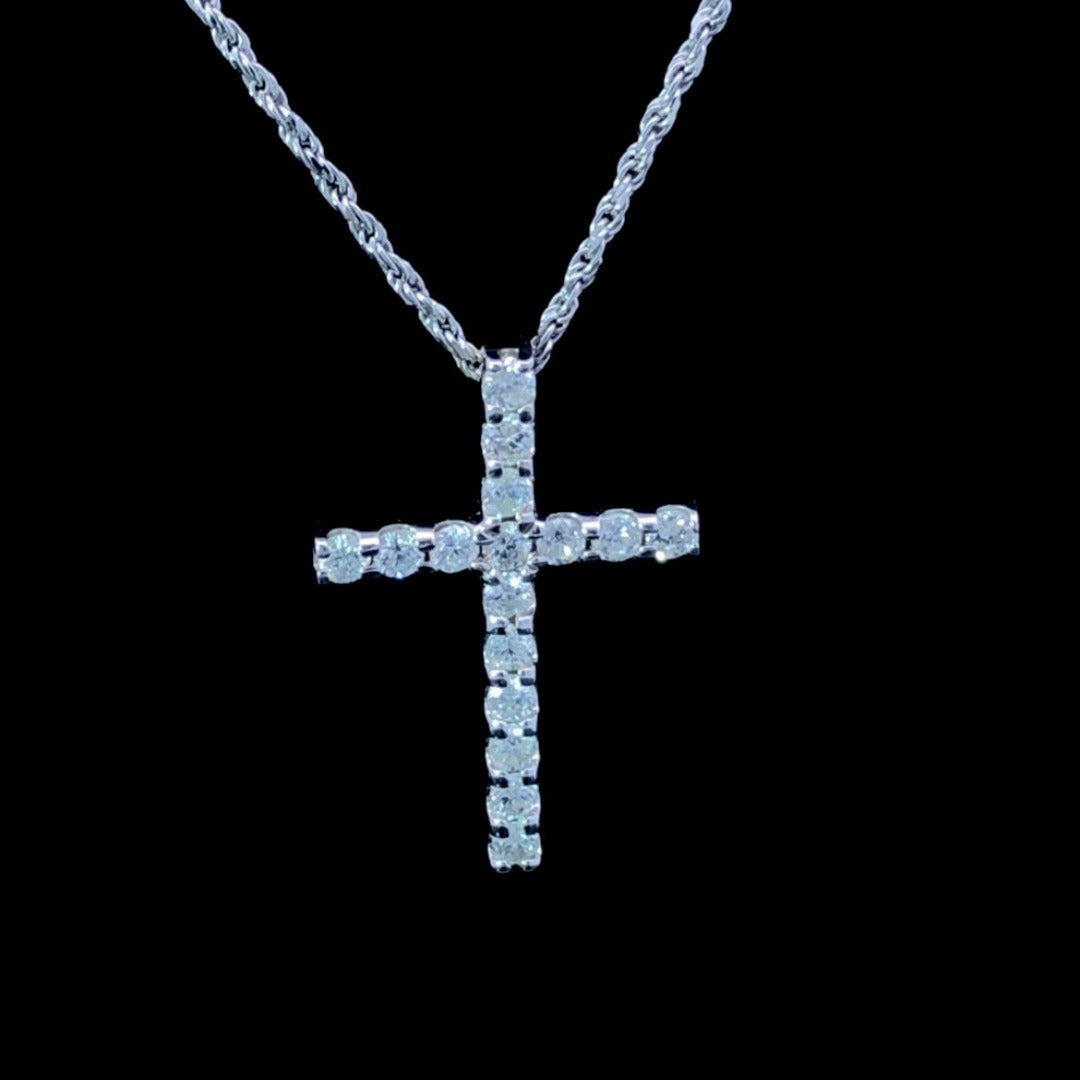 This elegant 14kt white gold cross pendant features an exquisite .48ctw diamond setting, adding a touch of luxurious sophistication to your everyday wardrobe. Be radiant and make an impression with this stunning, timeless piece. Chain is not included.