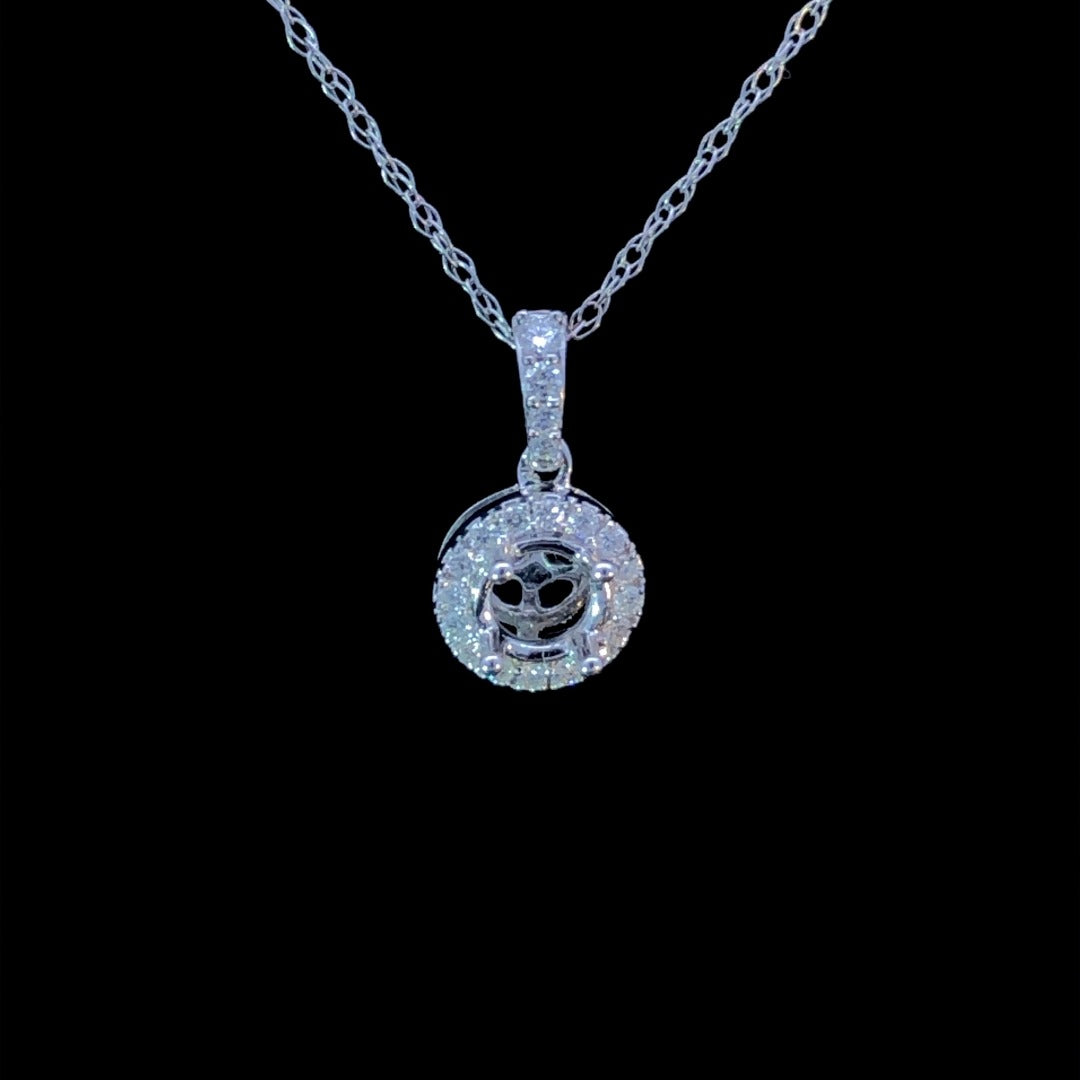 Dazzle the crowd with this stunning 14kt white gold round halo pendant mounting. Crafted with .12ctw of shimmering round diamonds, this beauty will take your breath away. Wear it day or night for a look that will never go out of style! Price is for the mounting only. Center stone will be added at an additional cost. Chain is not included.