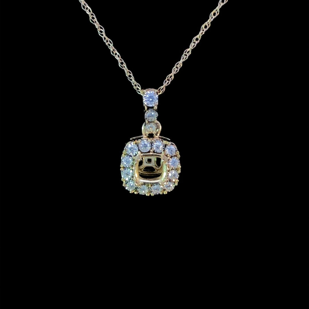 This classic 14kt yellow gold halo pendant mounting sparkles with .09ctw of round diamonds, gleaming with timeless elegance. Enhance your style with this beautiful diamond accessory, perfect for everyday wear or for special occasions. Price is for mounting only. Center stone can be added at an additional cost. Chain is not included.