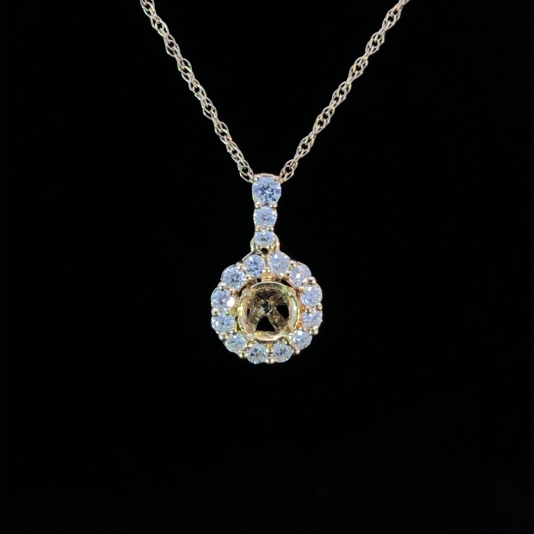 Create a stunning look with this classic diamond halo pendant mounting! Crafted from 14kt yellow gold, it'll shimmer with .18ctw of round diamonds sparkling from every angle. Make a bold statement with this beautiful piece of jewelry! Price is for mounting only. Center stone will be added at an additional cost. Chain is not included.