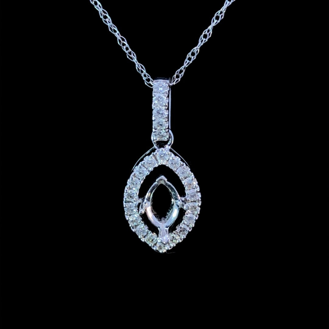 This stunning marquise halo pendant mounting will have everyone turning heads. The 14kt white gold setting sparkles with .22ctw of diamonds for a look that will never go out of style. Light up any room with this eye-catching and unique halo pendant! Price is for mounting only. Center stone will be added at an additional cost. Chain is not included.