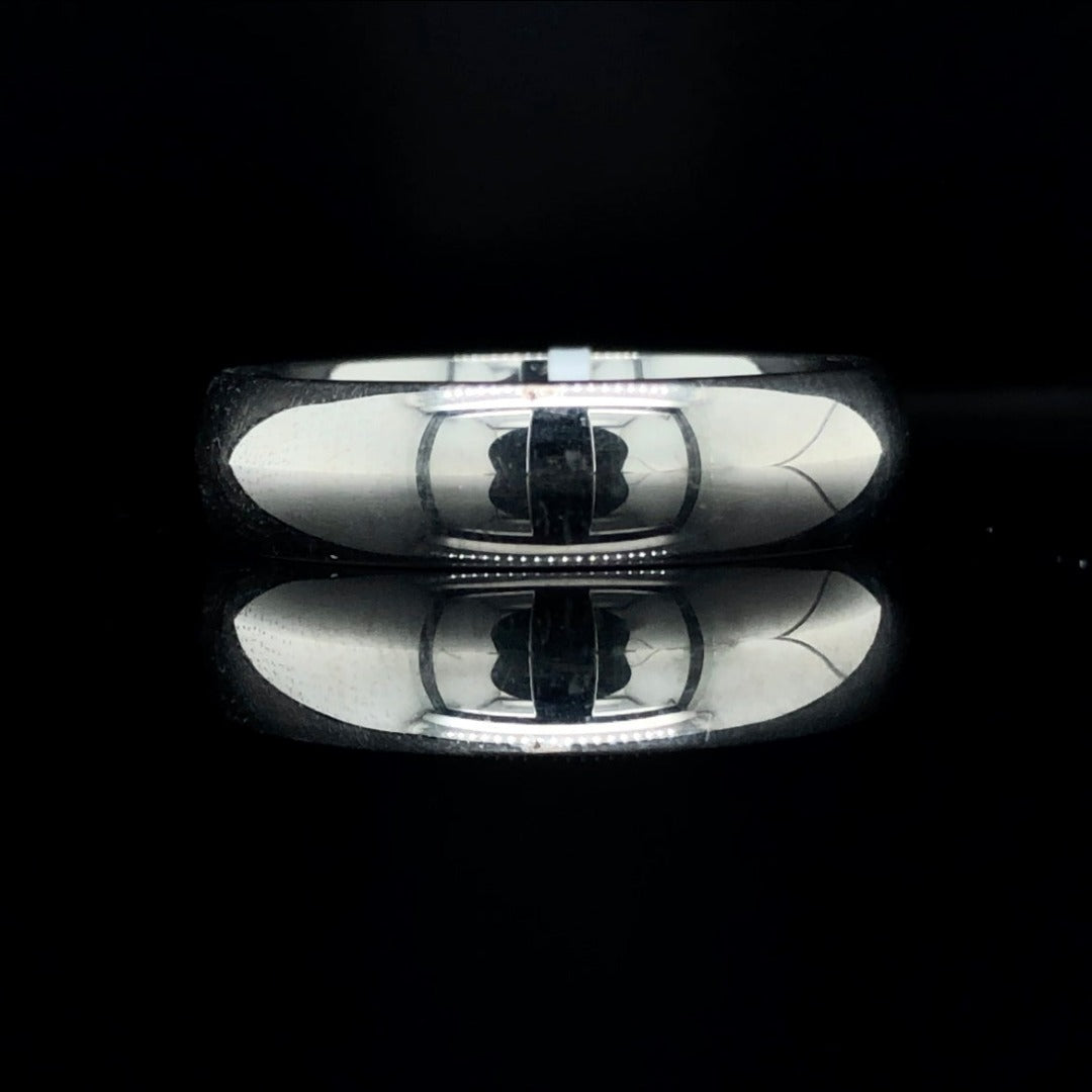Sophisticated yet timeless, this 5mm plain comfort fit band in 14kt white gold is a luxurious finishing touch to any outfit. This ring is a size 9, if that's not a perfect fit contact the store for sizing information. Sizing fees can apply. Enjoy the fine craftsmanship and high-quality design, perfect to wear every day. Make a statement with this exquisite piece of jewelry.