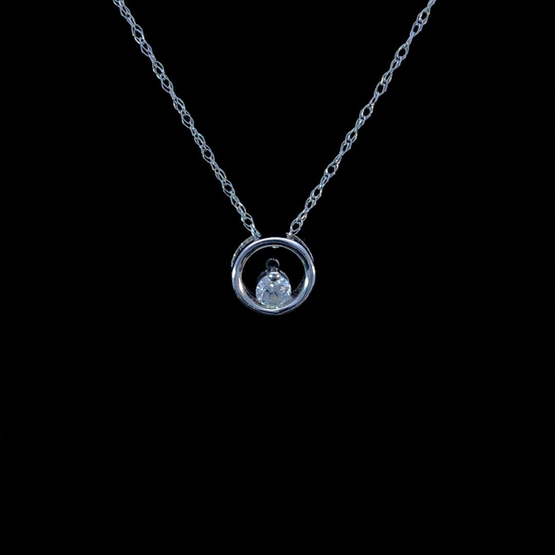 This exquisite 14kt white gold pendant offers an air of sophistication and refinement with its delicate diamond centerpiece embedded in a classic white gold circle. With its timeless charm and luxurious construction, this pendant is sure to become a treasured piece of jewelry. Chain is not included.
