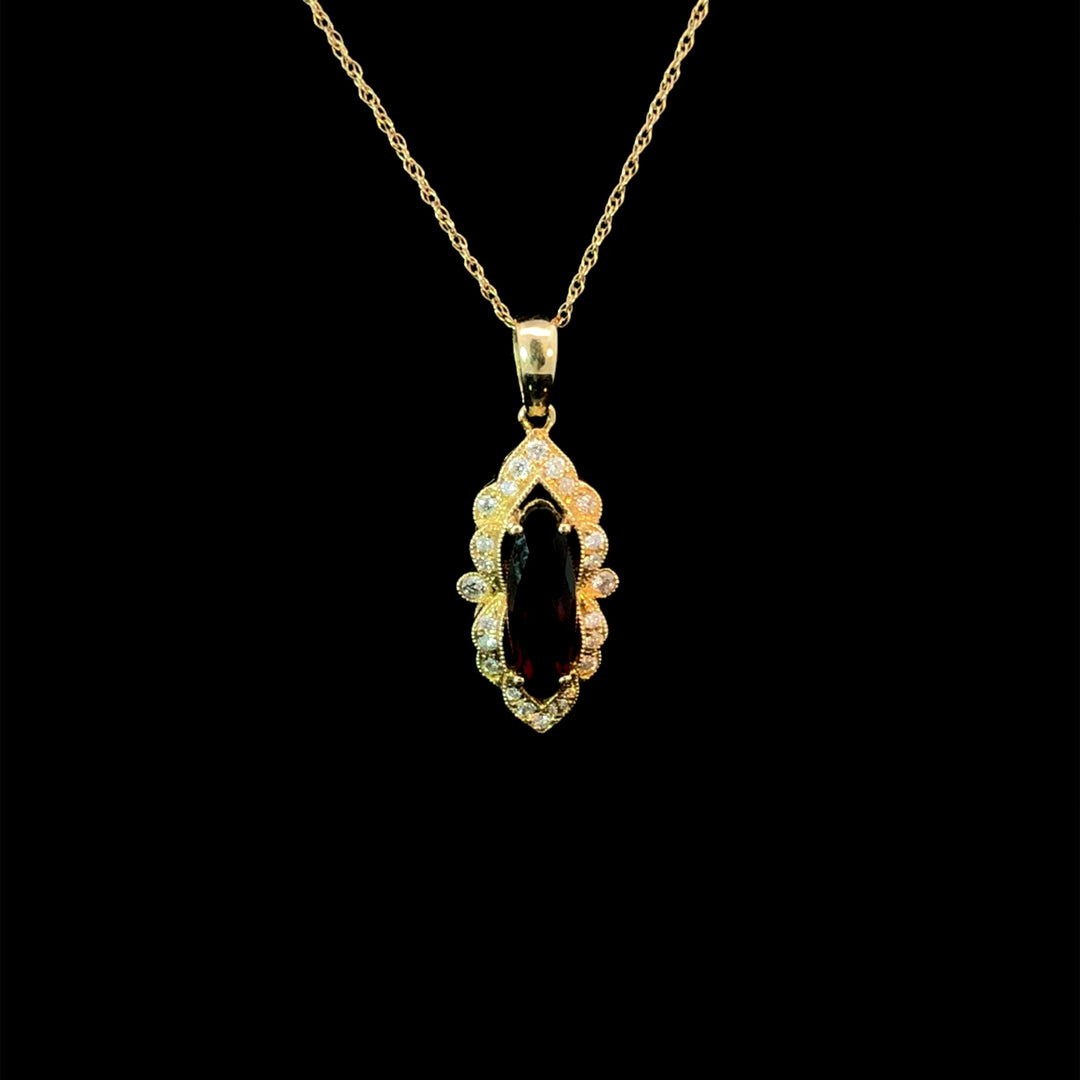 Indulge in the luxurious beauty of this pendant. Featuring a stunning 1.44ct garnet center stone, encircled by intricate 14kt yellow gold and .16ctw round diamond accents. Elevate any outfit with this captivating piece. Chain is not included.