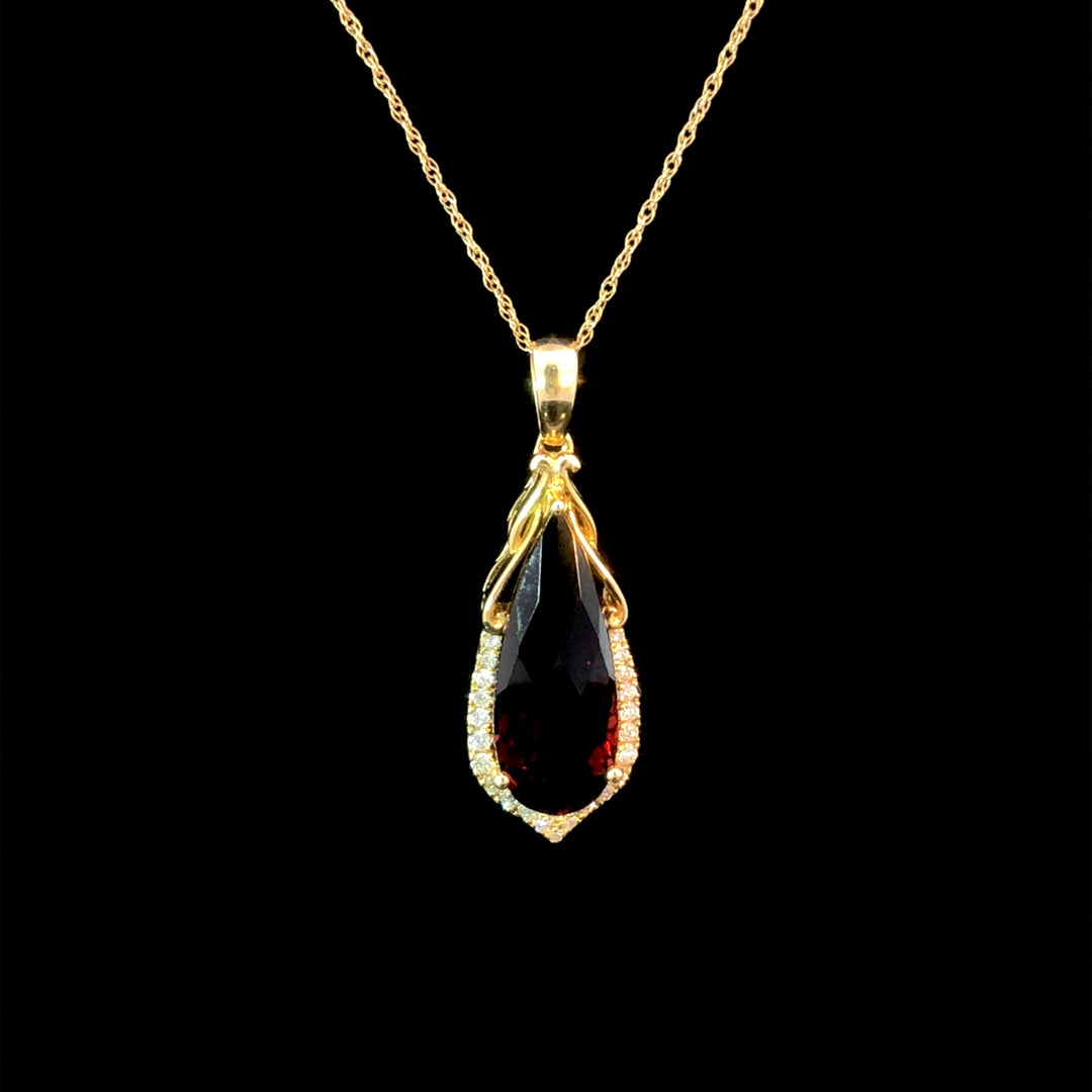 Make a statement with our 14kt yellow gold pendant, featuring a stunning 5.66ct pear shaped garnet and .15ctw of round diamonds. This unique piece adds a touch of elegance and sophistication to any outfit. An eye-catching addition to your jewelry collection. Chain is not included.