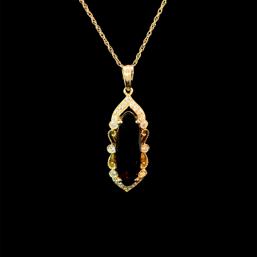 This exquisite pendant boasts a 3.10ct garnet center stone, encircled by intricate 14kt yellow gold details and accented with .13ctw of sparkling round diamonds. Make a bold statement and add a touch of luxury to your jewelry collection. Chain is not included.
