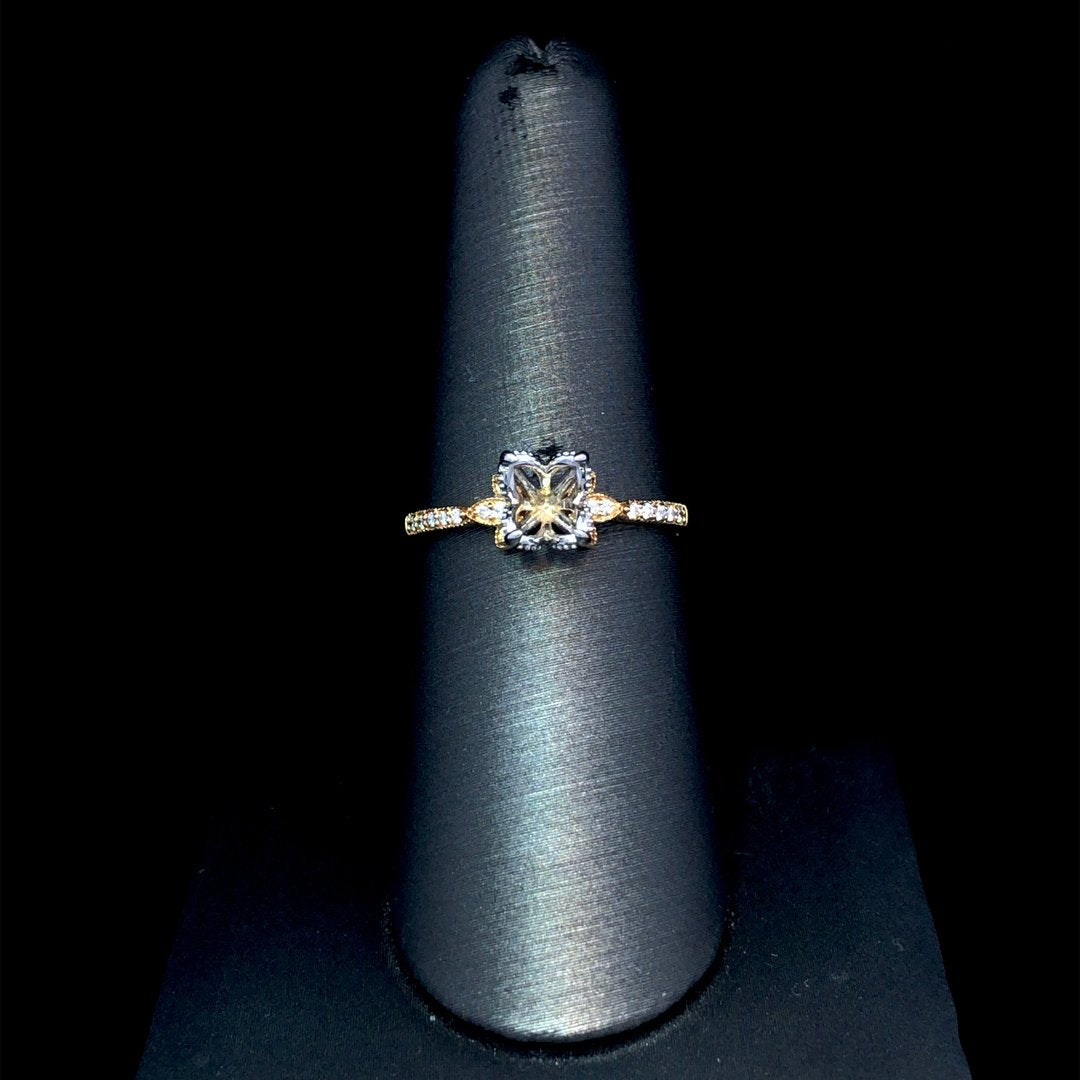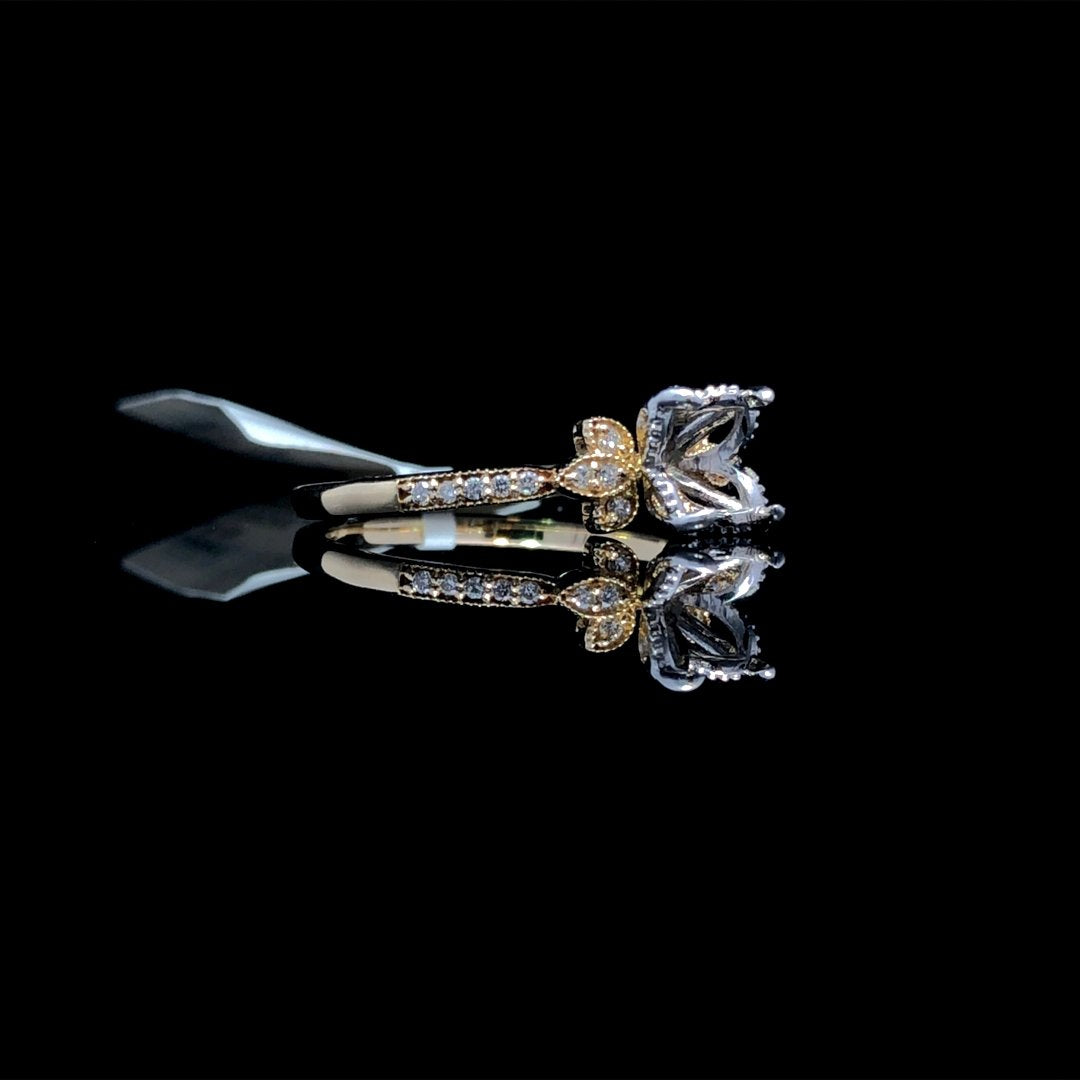 Looking for a stunning setting for your chosen center stone? This diamond semi mount is the perfect option. With a sleek white gold tulip-style head and a beautifully detailed design on the sides, this ring is adorned with .09ctw round diamonds in 14kt yellow gold. Elevate your style and make a statement with this chic and elegant choice! Price is for the semi mount only. Center stone will be added at an additional cost. This ring is a size 7. If that size is not a perfect fit, first time sizing is free at the time of purchase. Additional sizing fees may apply.