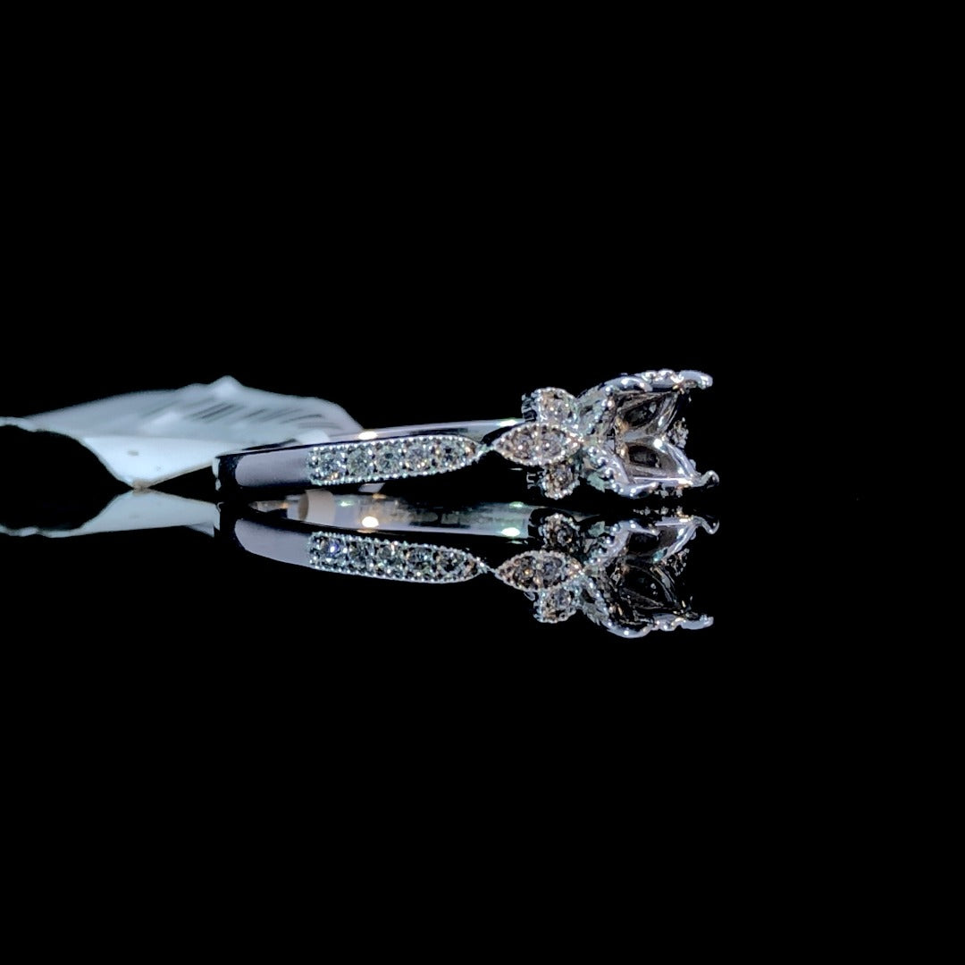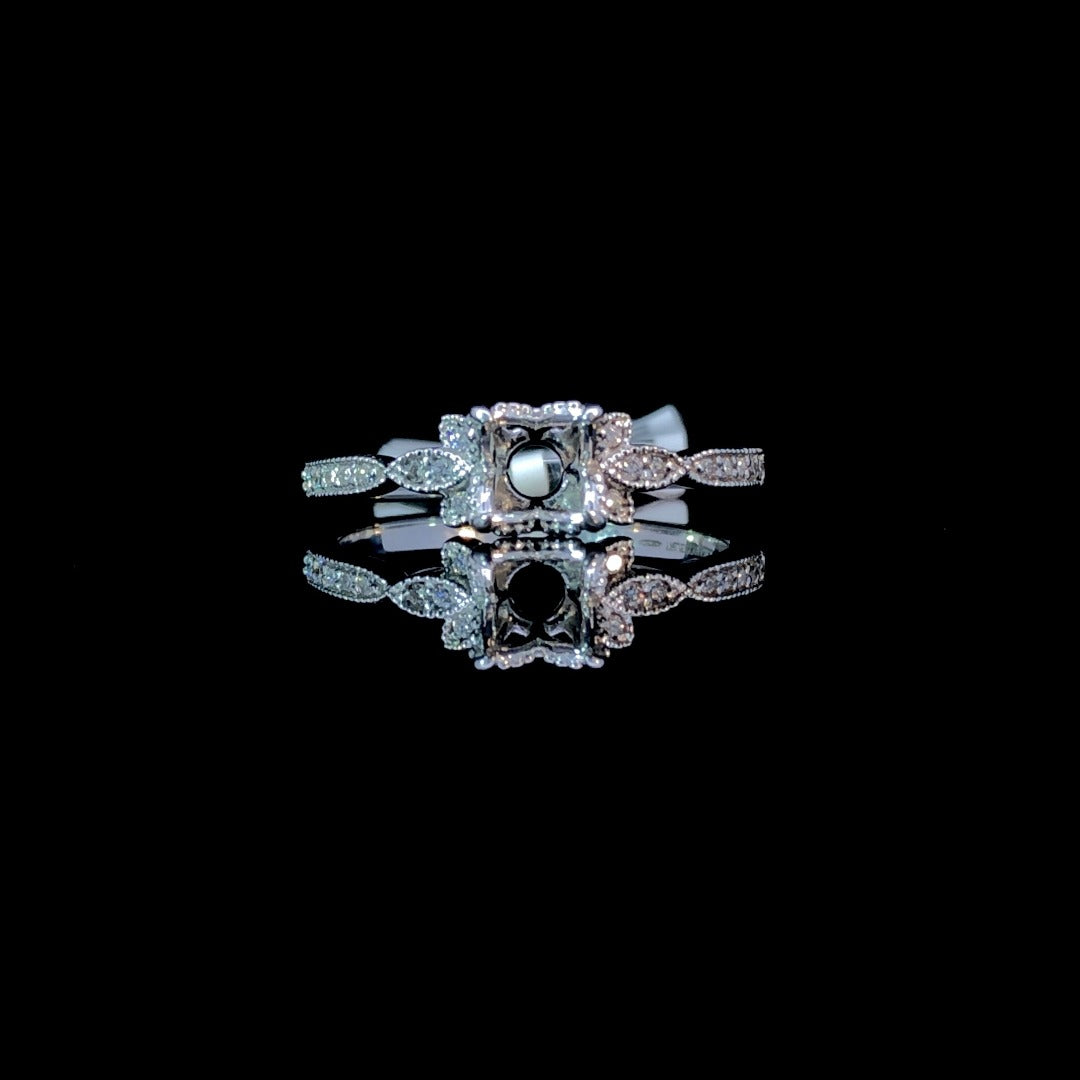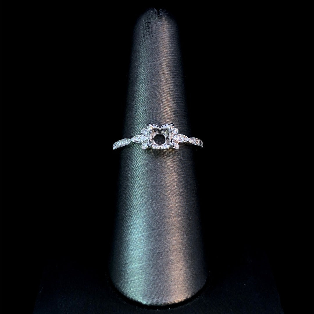 Elevate your look with our stunning semi mount! Featuring a chic design with delicate milgrain details and sparkling 0.09ctw of round diamonds set in 14kt white gold. Choose your center stone from our wide selection of loose stones to create a truly unique and beautiful piece. Price is for the semi mount only. Center stone will be added at an additional cost. This ring is a size 7. If that size is not a perfect fit, first time sizing is free at the time of purchase. Additional sizing fees may apply.