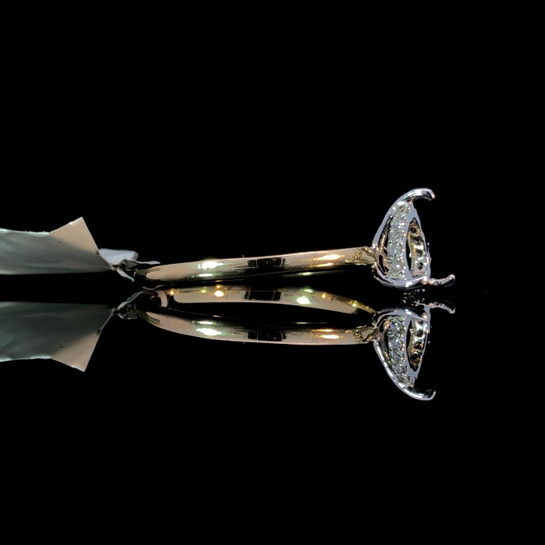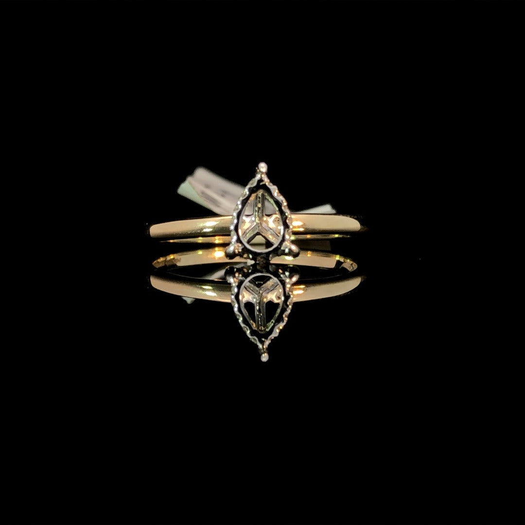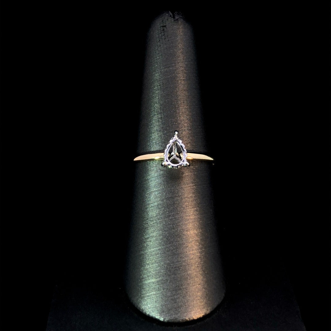 Indulge in luxury with this exquisite 14kt 2-tone gold semi mount adorned with a hidden halo of sparkling diamonds (.06ctw). Create a one-of-a-kind piece by selecting a pear-shaped center stone from our collection of loose stones. A sophisticated choice for the discerning buyer. Price is for the semi mount only. Center stone will be added at an additional cost. This ring is a size 7. If that size is not a perfect fit, first time sizing is free at the time of purchase. Additional sizing fees may apply.