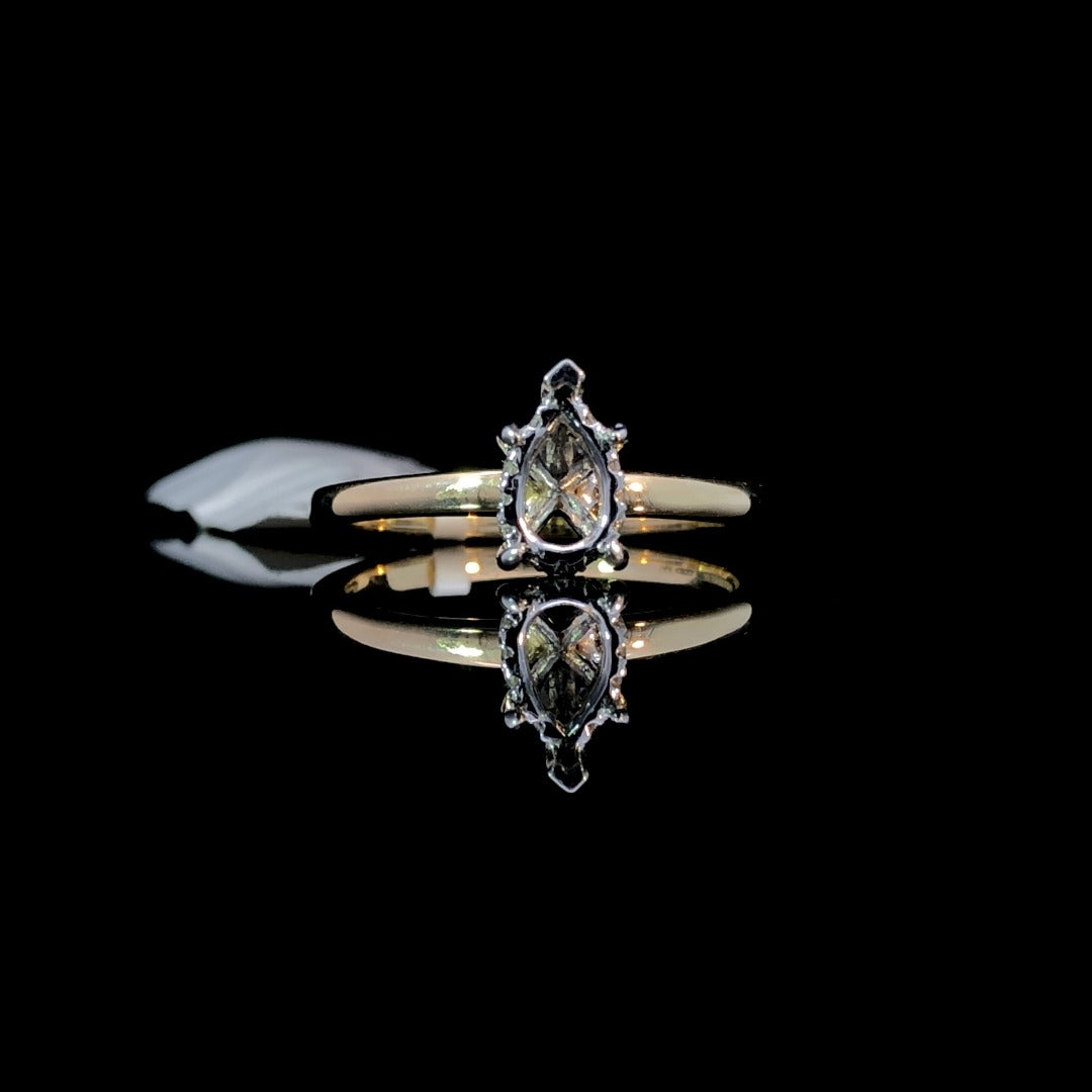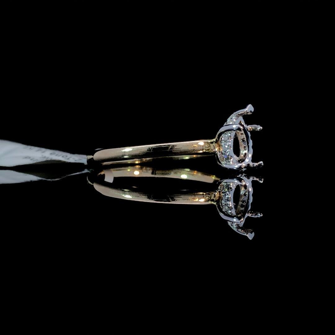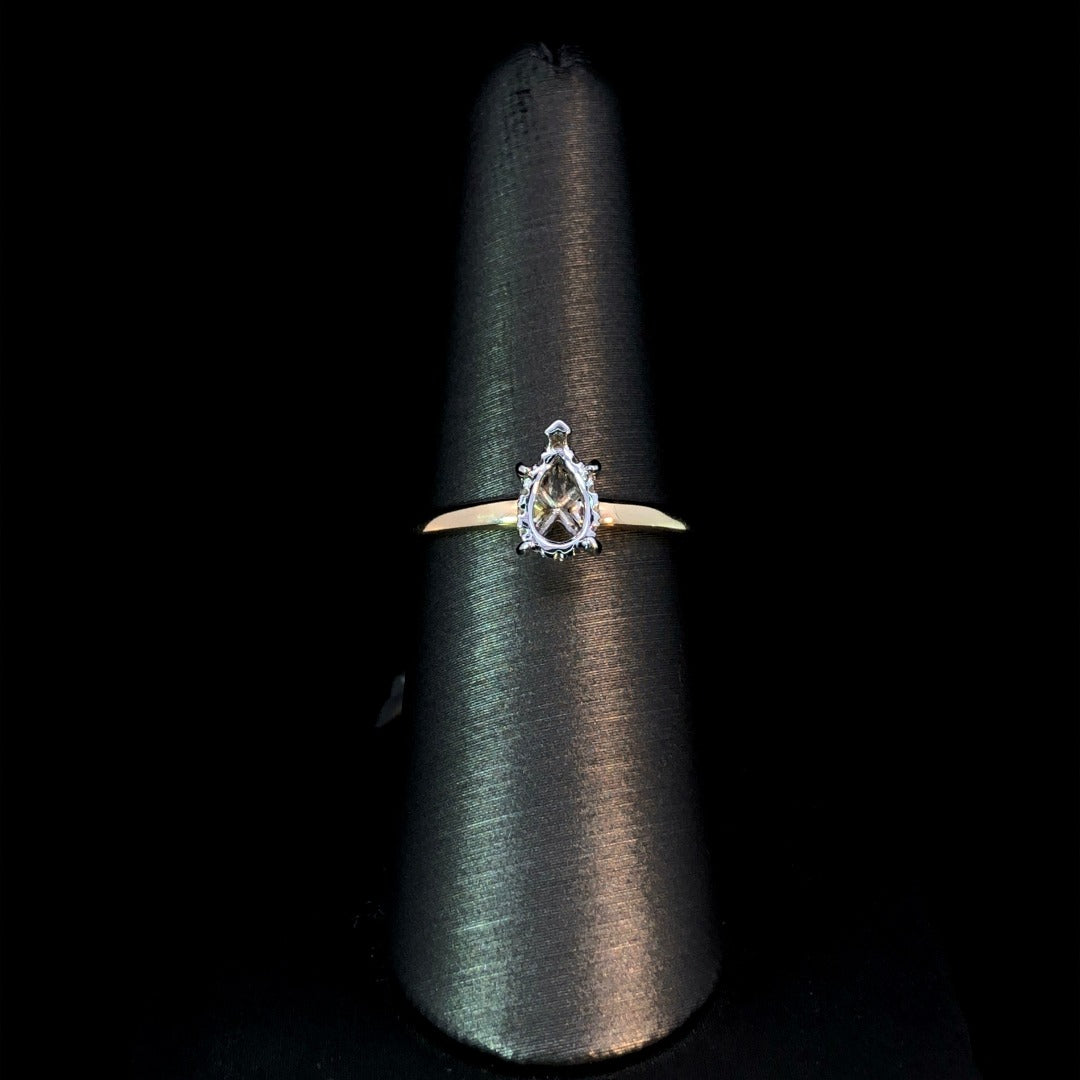 Elevate your bridal look with our gorgeous diamond semi mount. This chic piece boasts a pear-shaped hidden halo, adorned with .07ctw of round diamonds, set in a white gold head. The 14kt yellow gold band adds warmth to this trendy design. Choose your dream pear shaped center stone from our large loose stone inventory to complete this luxurious and exclusive piece. Price is for the semi mount only. Center stone will be added at an additional cost. This ring is a size 7. If that size is not a perfect fit, first time sizing is free at the time of purchase. Additional sizing fees may apply.