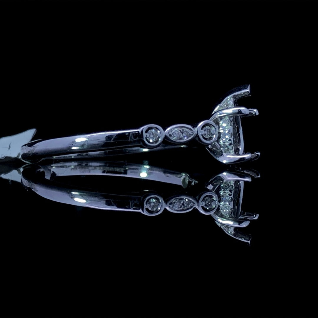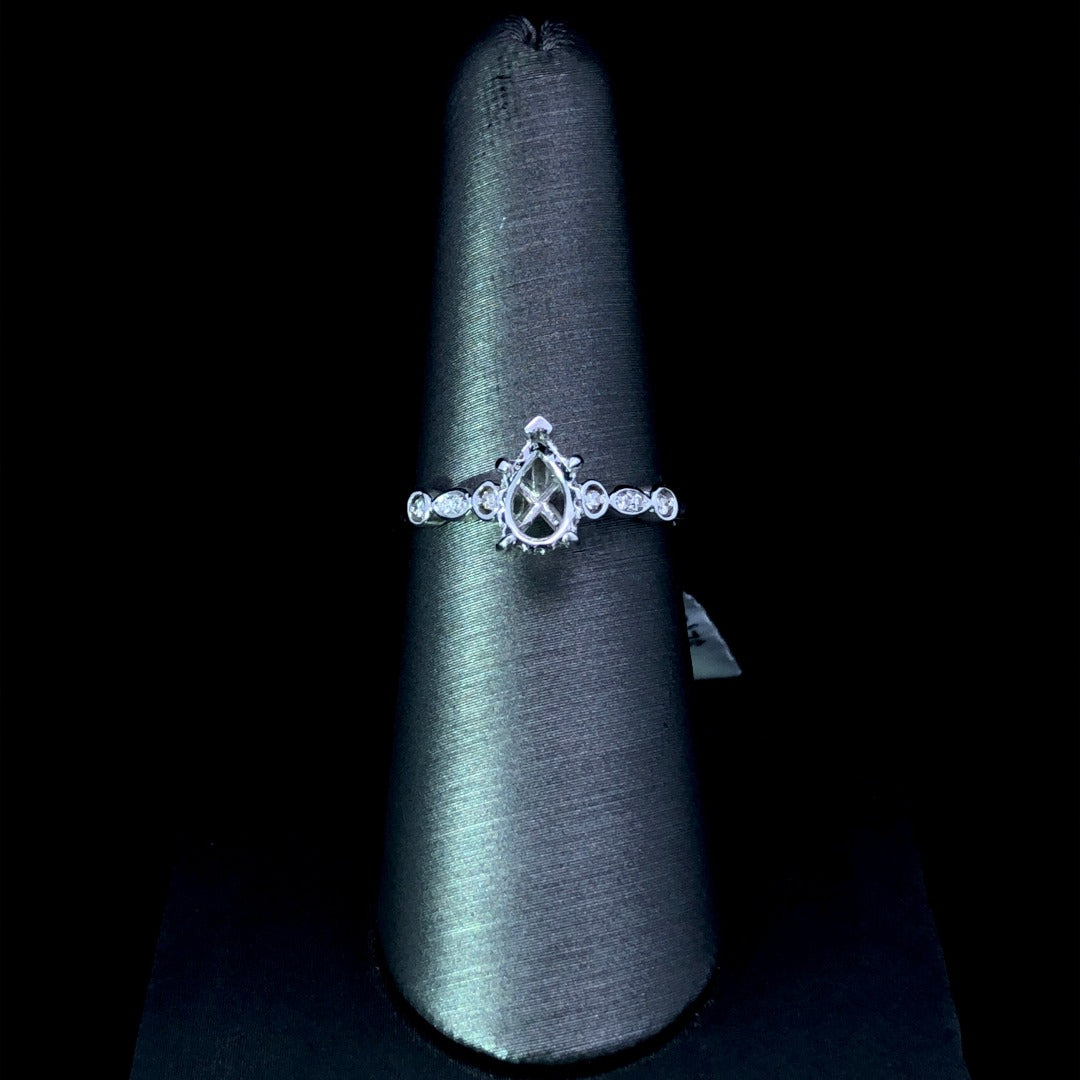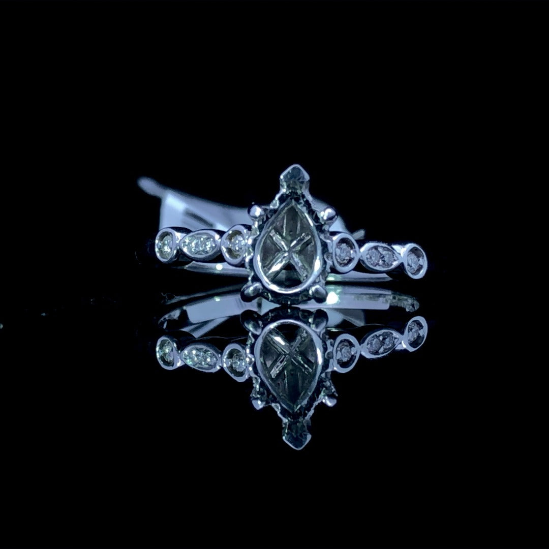 This chic diamond semi mount is the perfect choice for the modern bride. Sleekly crafted in 14kt white gold, it draws the eye to the pear shape stone of your choice, encircled by a hidden halo of round diamonds and showcased with additional round diamonds set in alternating shapes on the band. A glittering .11ctw of diamonds completes this stunning piece. Price is for the semi mount only. Center stone will be added at an additional cost. This ring is a size 7. If that size is not a perfect fit, first time sizing is free at the time of purchase. Additional sizing fees may apply.