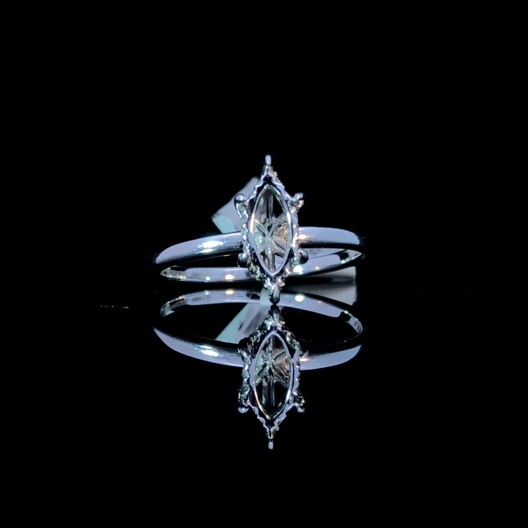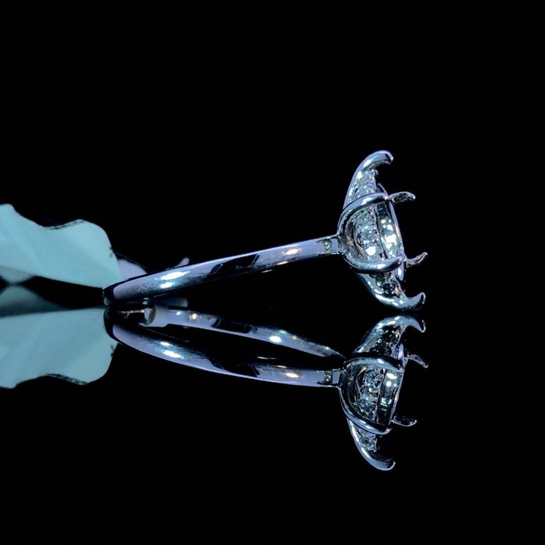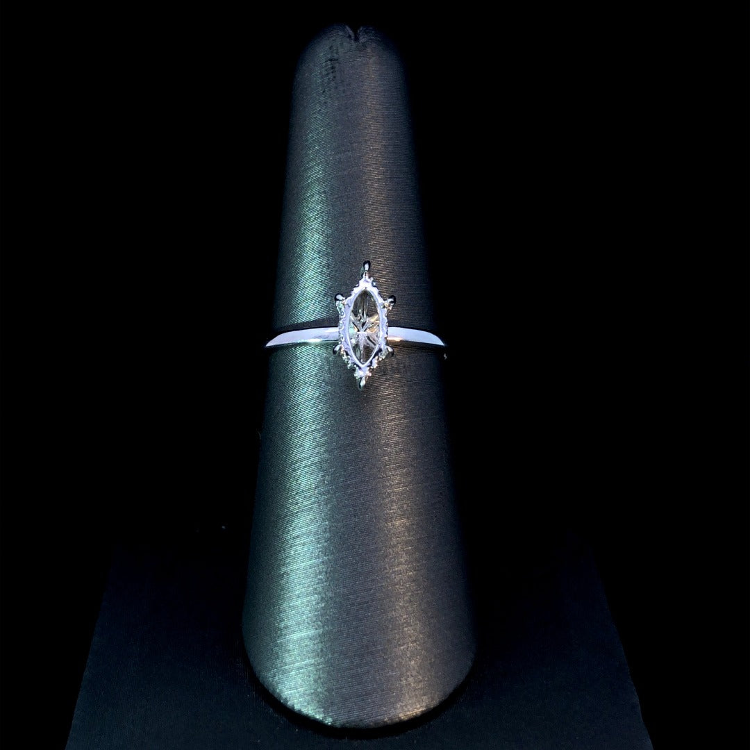 This stunning diamond semi mount is crafted from 14kt white gold and holds a hidden halo of .07ctw diamonds to complement the marquise center stone of your choice. Make a timeless statement in luxury and indulge in the sophistication and elegance of this exquisite piece. Price is for the semi mount only. Center stone will be added at an additional cost. This ring is a size 7. If that size is not a perfect fit, first time sizing is free at the time of purchase. Additional sizing fees may apply.