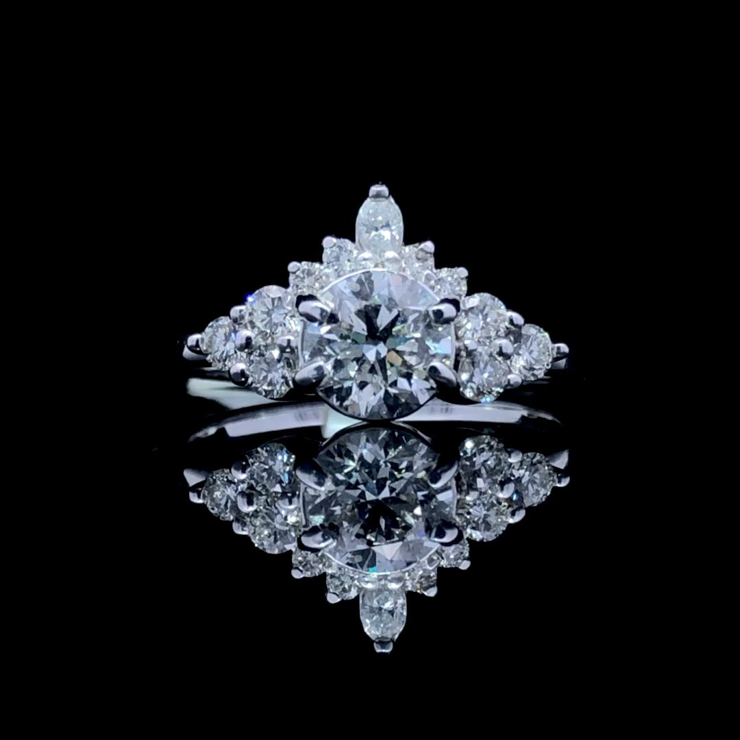 This exquisite ring is a stunning marriage of modern and classic design. A 1.00ct round center stone is encircled by a unique arrangement of diamonds, totaling .43ctw. The entire ensemble is artfully set in 14kt white gold for an unforgettable look. Perfect for special occasions, it is sure to leave a lasting impression. This ring is a size 7. If that size is not a perfect fit, first time sizing is free at the time of purchase. Additional sizing fees may apply.